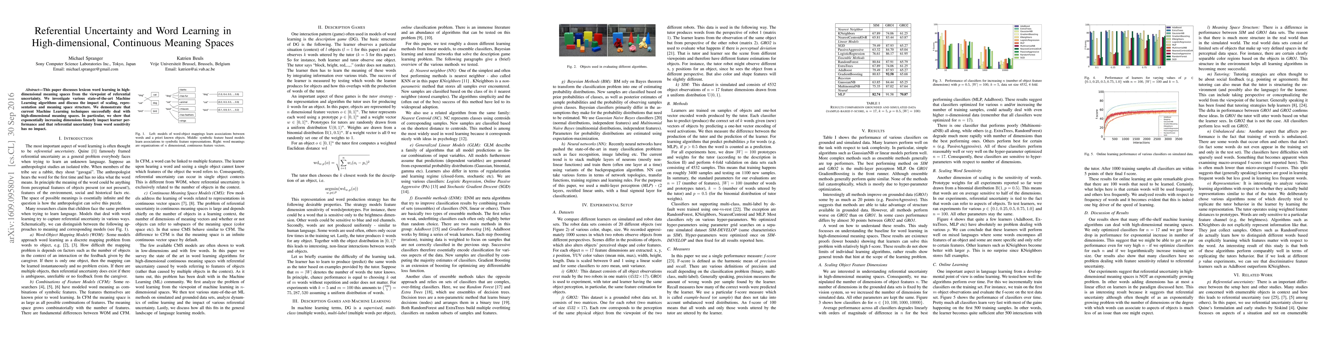 This paper explores word learning in high-dimensional, continuous meaning spaces through the lens of referential uncertainty, employing advanced Machine Learning algorithms. It finds that while dimension scaling linearly affects performance, referential uncertainty due to word sensitivity does not impact learning outcomes.
