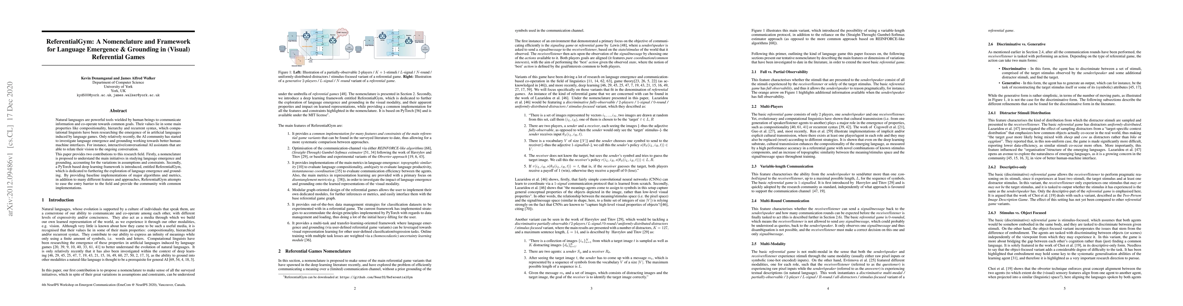 The paper introduces ReferentialGym, a PyTorch-based deep learning framework for studying language emergence and grounding in visual referential games, accompanied by a nomenclature to understand variations in assumptions and constraints across different initiatives.