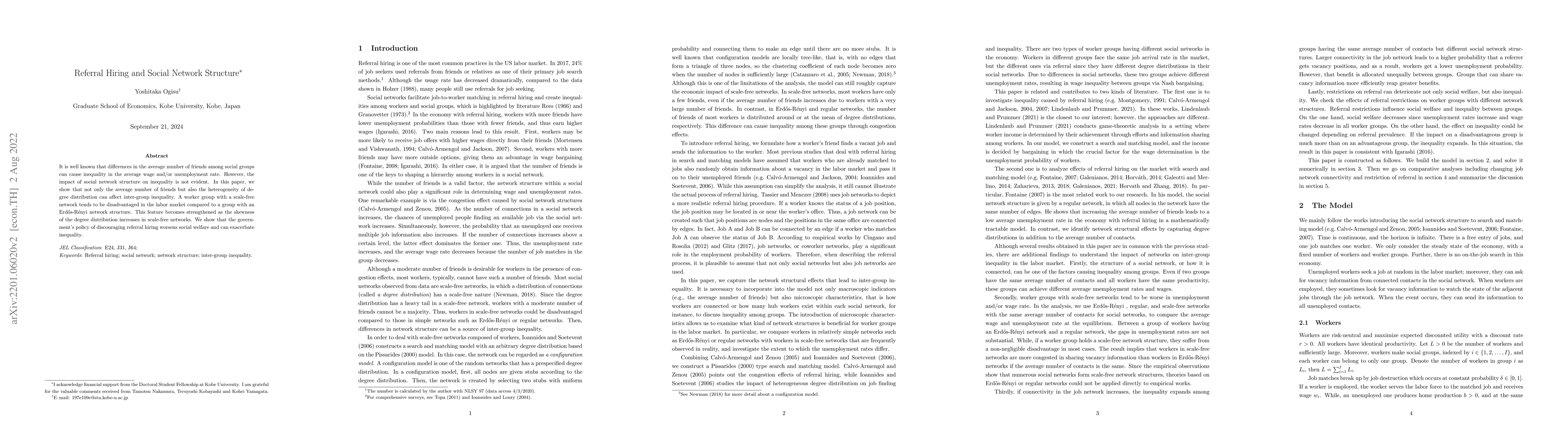 This paper investigates how social network structures influence inter-group inequality in hiring and wages, finding that scale-free networks lead to greater disadvantage compared to random networks. It concludes that government policies discouraging referral hiring may worsen social welfare and exacerbate inequality.