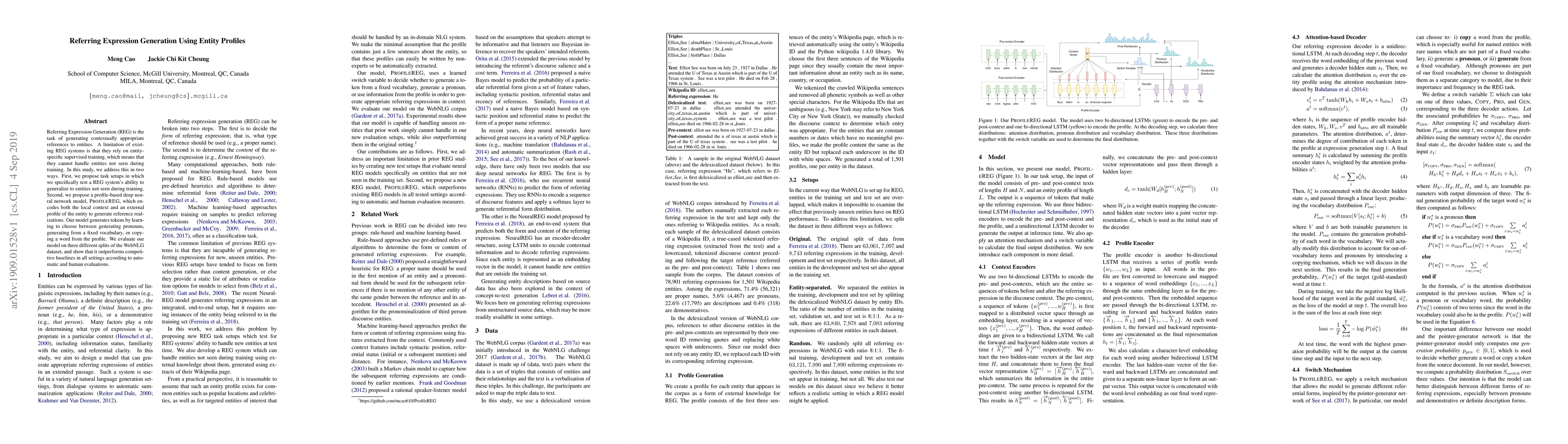 This paper proposes a profile-based deep neural network model, ProfileREG, to generate contextually appropriate referring expressions by encoding both local context and entity profiles, enabling generalization to unseen entities. The model outperforms baselines on the WebNLG dataset, demonstrating improved performance in both automatic and human evaluations.