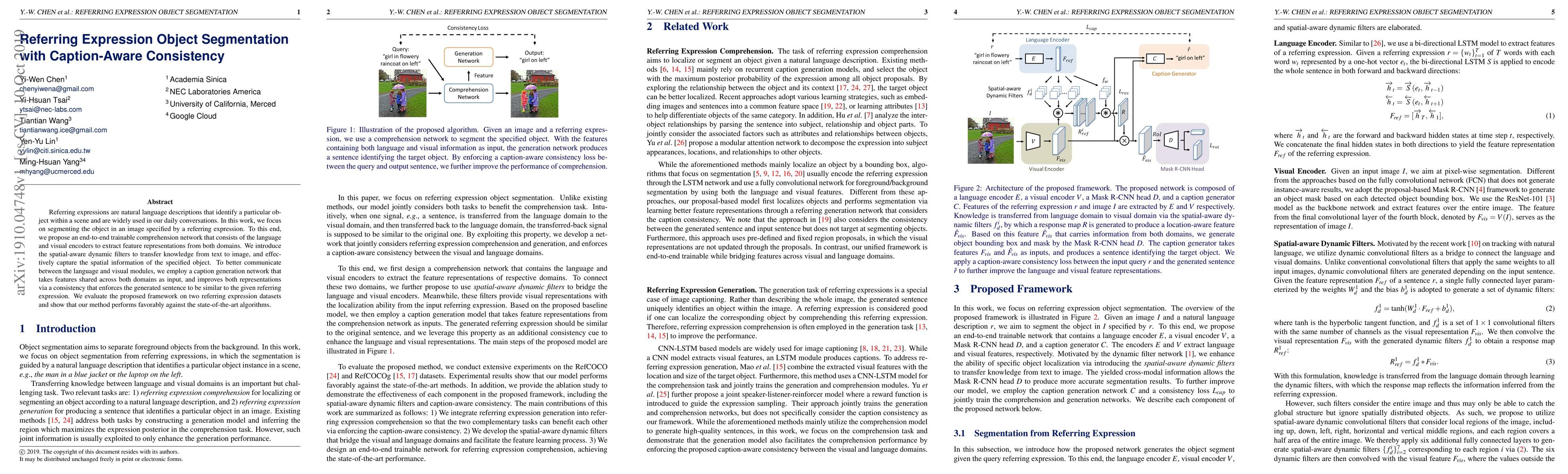 This paper proposes an end-to-end network for segmenting objects specified by referring expressions, utilizing language and visual encoders, spatial-aware dynamic filters, and a caption-aware consistency mechanism to enhance representation communication and performance. The method outperforms state-of-the-art algorithms on two datasets.