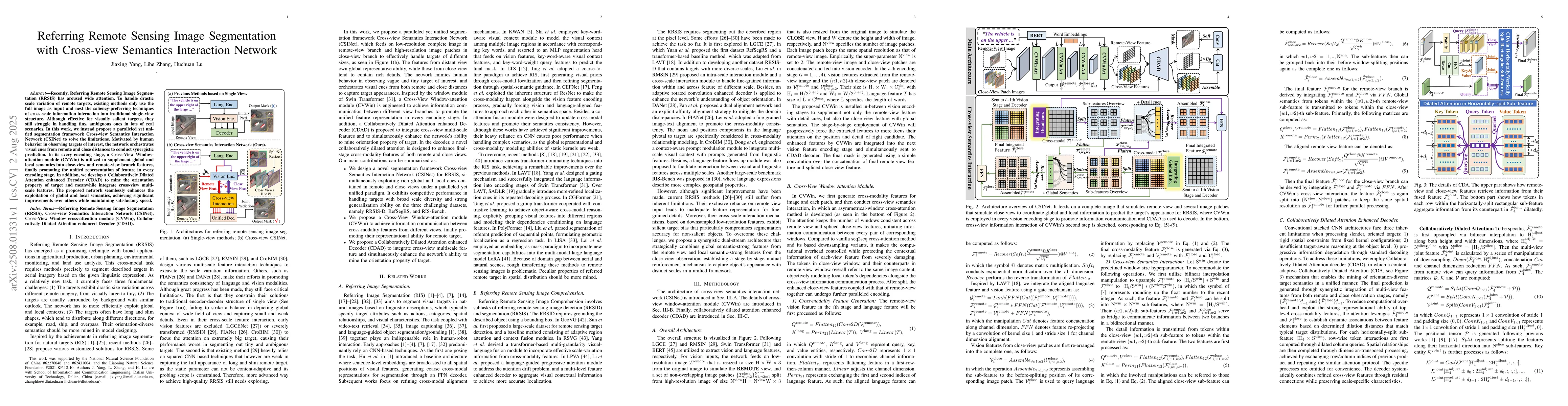 Recently, Referring Remote Sensing Image Segmentation (RRSIS) has aroused wide attention. To handle drastic scale variation of remote targets, existing methods only use the full image as input and nest the saliency-preferring techniques of cross-scale information interaction into traditional single-view structure. Although effective for visually salient targets, they still struggle in handling tiny, ambiguous ones in lots of real scenarios. In this work, we instead propose a paralleled yet unified segmentation framework Cross-view Semantics Interaction Network (CSINet) to solve the limitations. Motivated by human behavior in observing targets of interest, the network orchestrates visual cues from remote and close distances to conduct synergistic prediction. In its every encoding stage, a Cross-View Window-attention module (CVWin) is utilized to supplement global and local semantics into close-view and remote-view branch features, finally promoting the unified representation of feature in every encoding stage. In addition, we develop a Collaboratively Dilated Attention enhanced Decoder (CDAD) to mine the orientation property of target and meanwhile integrate cross-view multiscale features. The proposed network seamlessly enhances the exploitation of global and local semantics, achieving significant improvements over others while maintaining satisfactory speed.