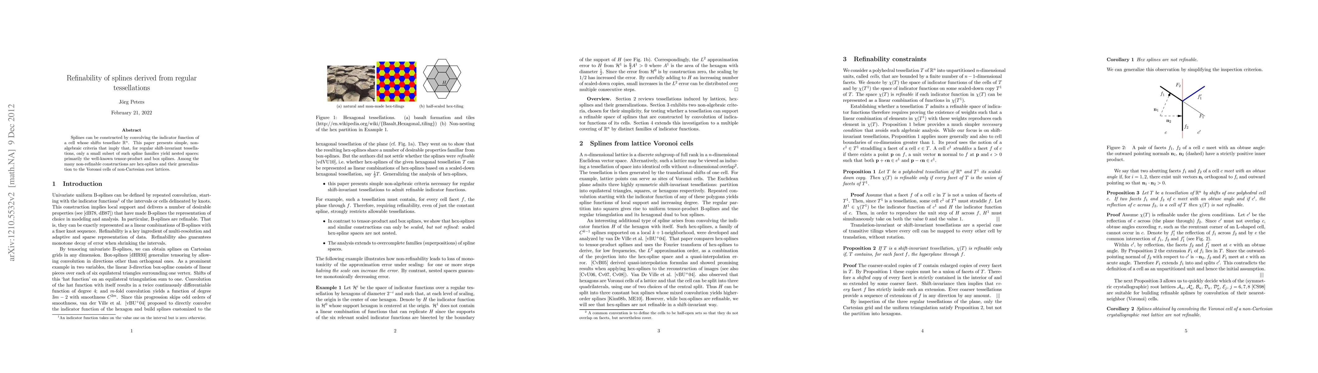 This paper identifies simple, non-algebraic criteria for the refinability of splines derived from regular tessellations, showing that only tensor-product and box splines yield nested spaces, while hex-splines and Voronoi cell-based splines are non-refinable.