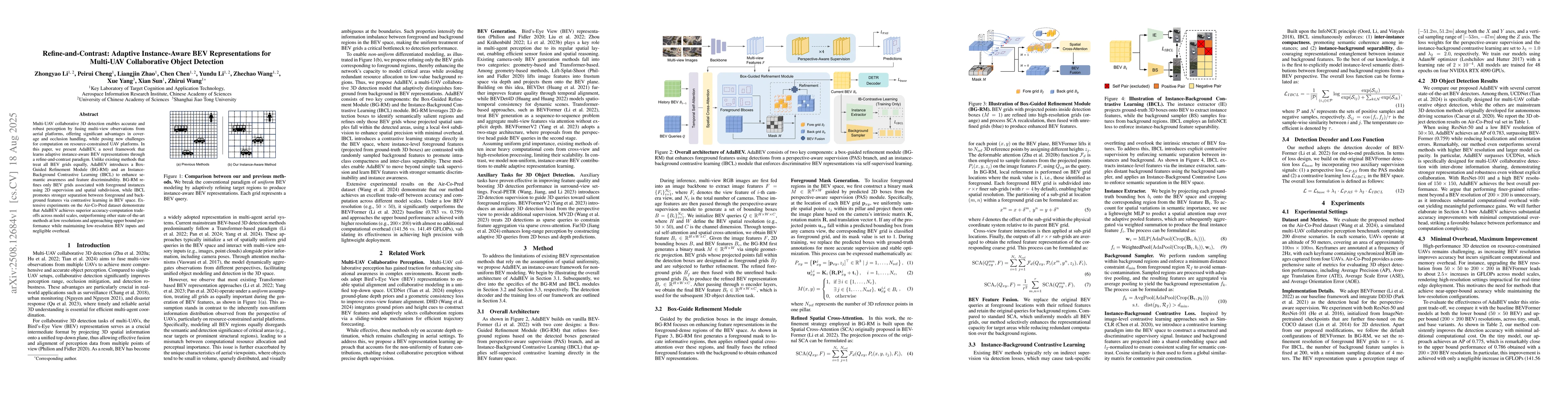 Multi-UAV collaborative 3D detection enables accurate and robust perception by fusing multi-view observations from aerial platforms, offering significant advantages in coverage and occlusion handling, while posing new challenges for computation on resource-constrained UAV platforms. In this paper, we present AdaBEV, a novel framework that learns adaptive instance-aware BEV representations through a refine-and-contrast paradigm. Unlike existing methods that treat all BEV grids equally, AdaBEV introduces a Box-Guided Refinement Module (BG-RM) and an Instance-Background Contrastive Learning (IBCL) to enhance semantic awareness and feature discriminability. BG-RM refines only BEV grids associated with foreground instances using 2D supervision and spatial subdivision, while IBCL promotes stronger separation between foreground and background features via contrastive learning in BEV space. Extensive experiments on the Air-Co-Pred dataset demonstrate that AdaBEV achieves superior accuracy-computation trade-offs across model scales, outperforming other state-of-the-art methods at low resolutions and approaching upper bound performance while maintaining low-resolution BEV inputs and negligible overhead.