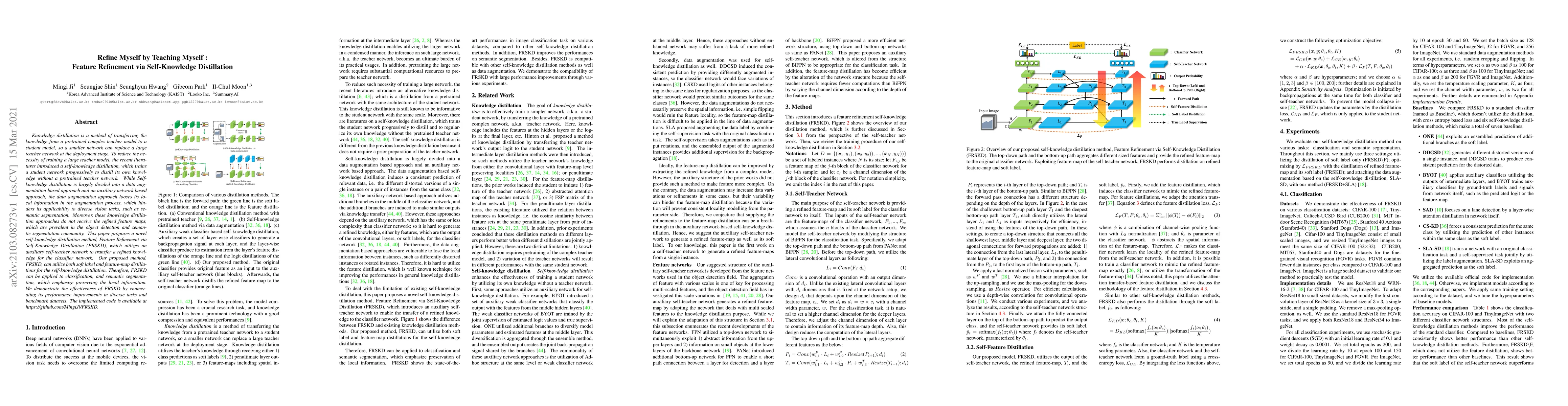 This paper introduces a novel self-knowledge distillation method called Feature Refinement via Self-Knowledge Distillation (FRSKD) that employs an auxiliary self-teacher network to transfer refined knowledge. FRSKD preserves local information and is applicable to tasks like classification and semantic segmentation.