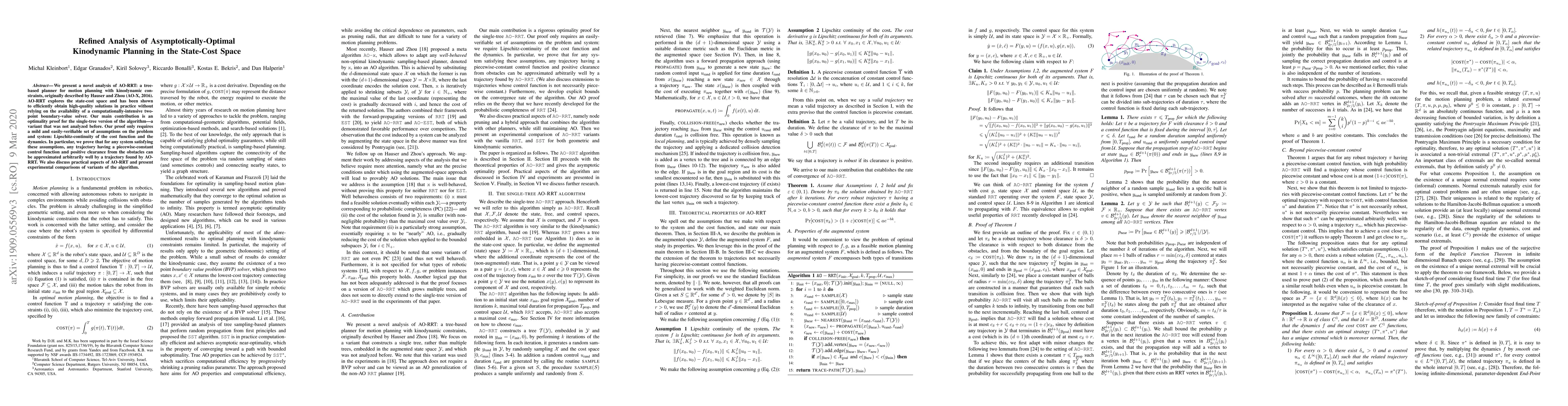 The research presents a novel analysis of AO-RRT, a tree-based planner for motion planning with kinodynamic constraints, originally described by Hauser and Zhou (AO-X, 2016). The analysis focuses on the single-tree version of the algorithm, which was not previously analyzed.