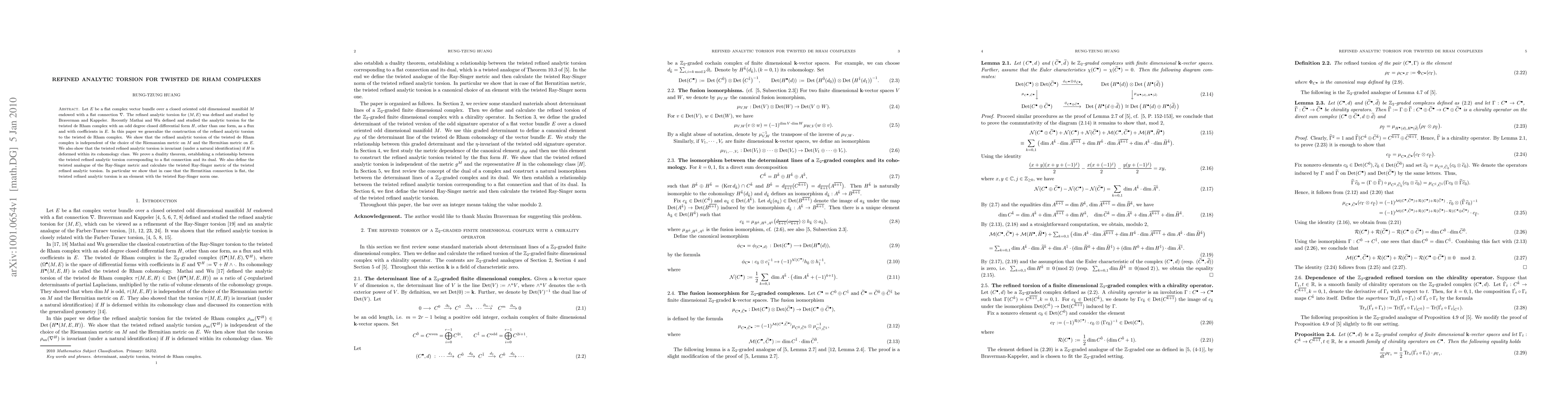 This paper generalizes the refined analytic torsion to twisted de Rham complexes, demonstrating its independence from metric choices and invariance under flux deformation. It establishes a duality theorem and defines the twisted Ray-Singer metric, showing that the twisted refined analytic torsion equals one when the Hermitian connection is flat.
