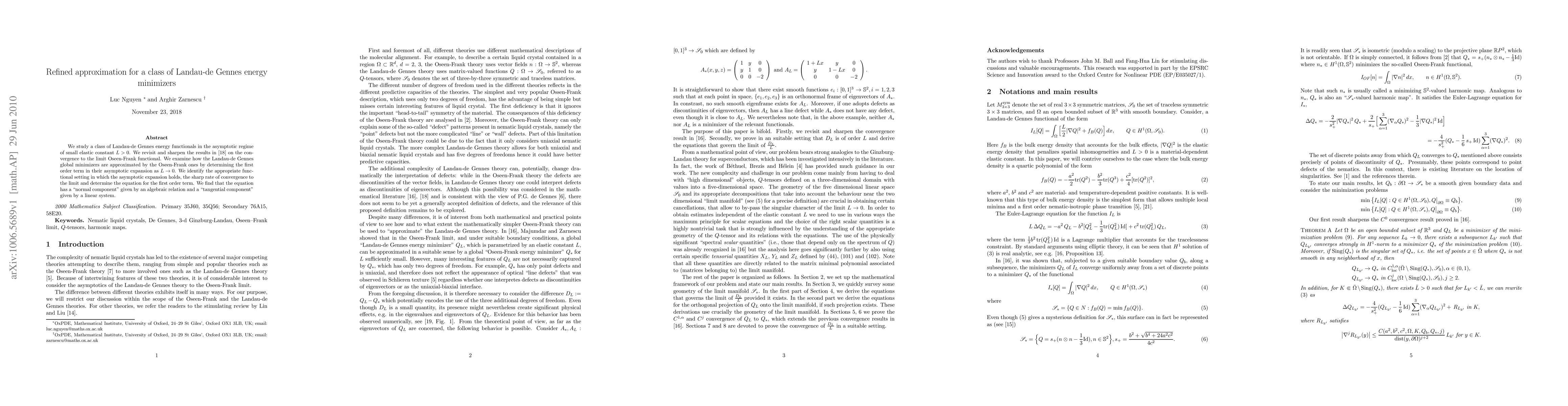 This paper refines the approximation of Landau-de Gennes energy minimizers by Oseen-Frank ones in the limit of small elastic constants. It determines the first-order term in their asymptotic expansion, identifying both an algebraic normal component and a linear tangential component in the resulting equation.