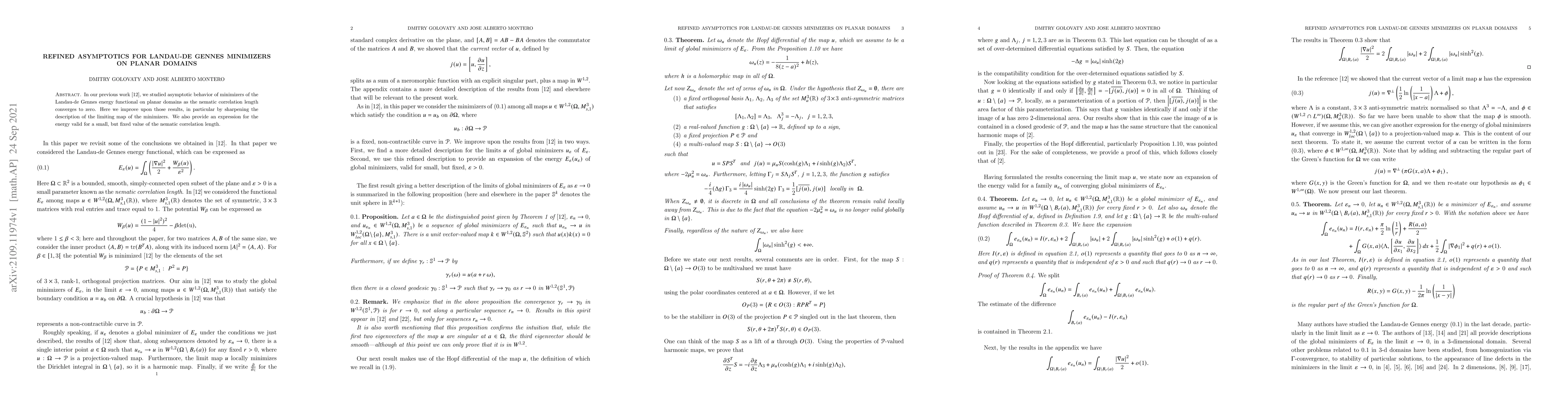 This paper refines previous asymptotic analyses of Landau-de Gennes minimizers on planar domains, enhancing the description of the limiting map and providing an energy expression for a small but fixed nematic correlation length.