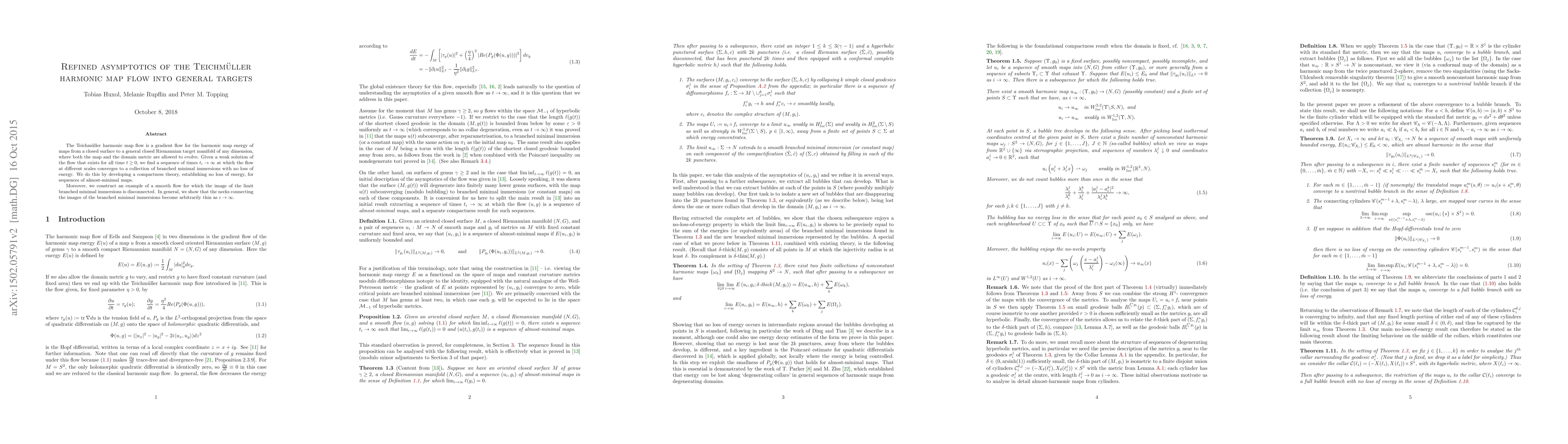 This paper develops a compactness theory for the Teichmüller harmonic map flow, proving that weak solutions converge asymptotically to branched minimal immersions without energy loss. It also constructs a smooth flow example where the limit immersions' images are disconnected, showing that necks between these images become arbitrarily thin.