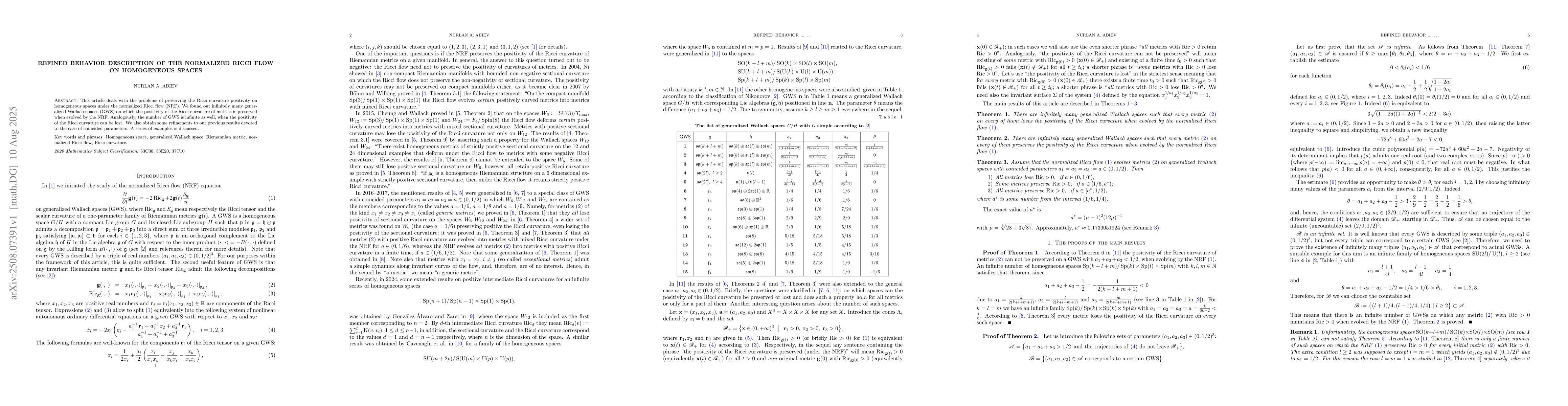 This article deals with the problems of preserving the Ricci curvature positivity on homogeneous spaces under the normalized Ricci flow (NRF). We found out infinitely many generalized Wallach spaces (GWS) on which the positivity of the Ricci curvature of metrics is preserved when evolved by the NRF. Analogously, the number of GWS is infinite as well, when the positivity of the Ricci curvature can be lost. We also obtain some refinements to our previous results devoted to the case of coincided parameters. A series of examples is discussed.