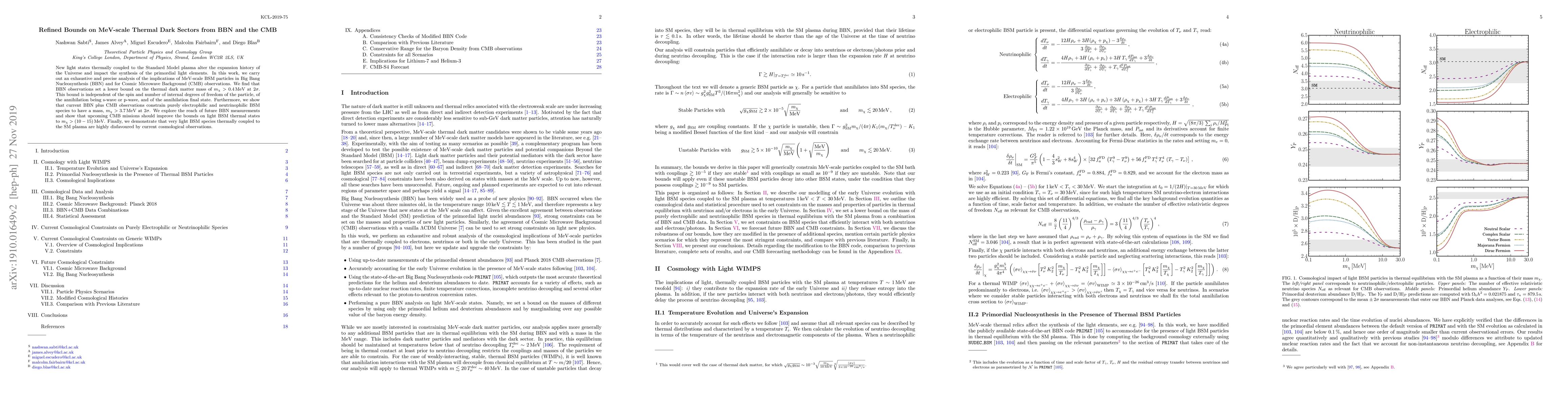 New light states thermally coupled to the Standard Model plasma alter the expansion history of the Universe and impact the synthesis of the primordial light elements. In this work, we carry out an exhaustive and precise analysis of the implications of MeV-scale BSM particles in Big Bang Nucleosynthesis (BBN) and for Cosmic Microwave Background (CMB) observations. We find that, BBN observations set a lower bound on the thermal dark matter mass of $m_\chi > 0.4\,\text{MeV}$ at $2\sigma$. This bound is independent of the spin and number of internal degrees of freedom of the particle, of the annihilation being s-wave or p-wave, and of the annihilation final state. Furthermore, we show that current BBN plus CMB observations constrain purely electrophilic and neutrinophilic BSM species to have a mass, $m_\chi > 3.7\,\text{MeV}$ at $2\sigma$. We explore the reach of future BBN measurements and show that upcoming CMB missions should improve the bounds on light BSM thermal states to $m_\chi > (10-15)\,\text{MeV}$. Finally, we demonstrate that very light BSM species thermally coupled to the SM plasma are highly disfavoured by current cosmological observations.