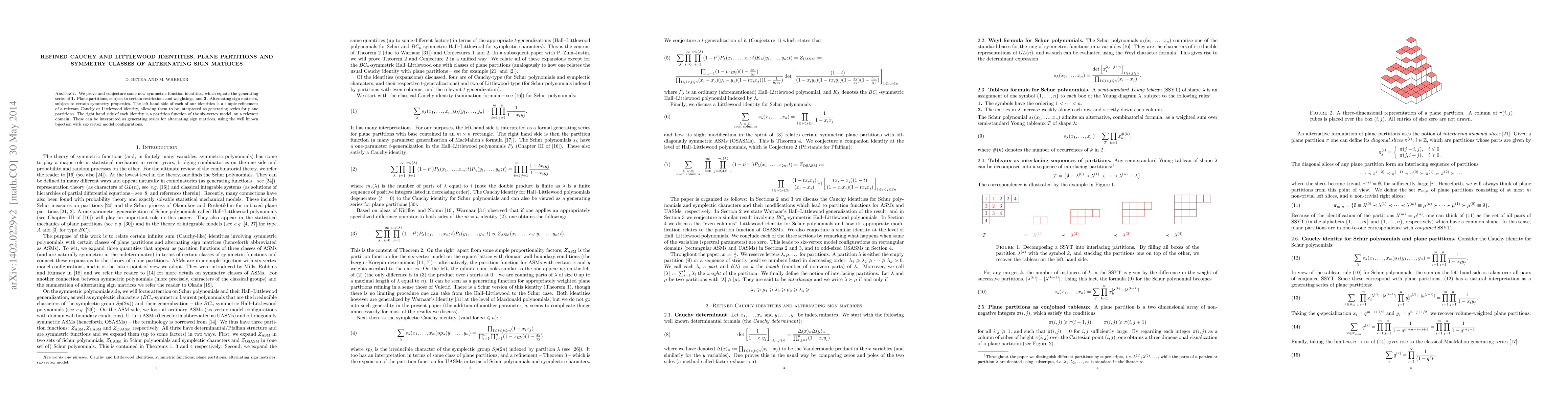 We prove and conjecture some new symmetric function identities, which equate the generating series of 1. Plane partitions, subject to certain restrictions and weightings, and 2. Alternating sign matrices, subject to certain symmetry properties. The left hand side of each of our identities is a simple refinement of a relevant Cauchy or Littlewood identity, allowing them to be interpreted as generating series for plane partitions. The right hand side of each identity is a partition function of the six-vertex model, on a relevant domain. These can be interpreted as generating series for alternating sign matrices, using the well known bijection with six-vertex model configurations.