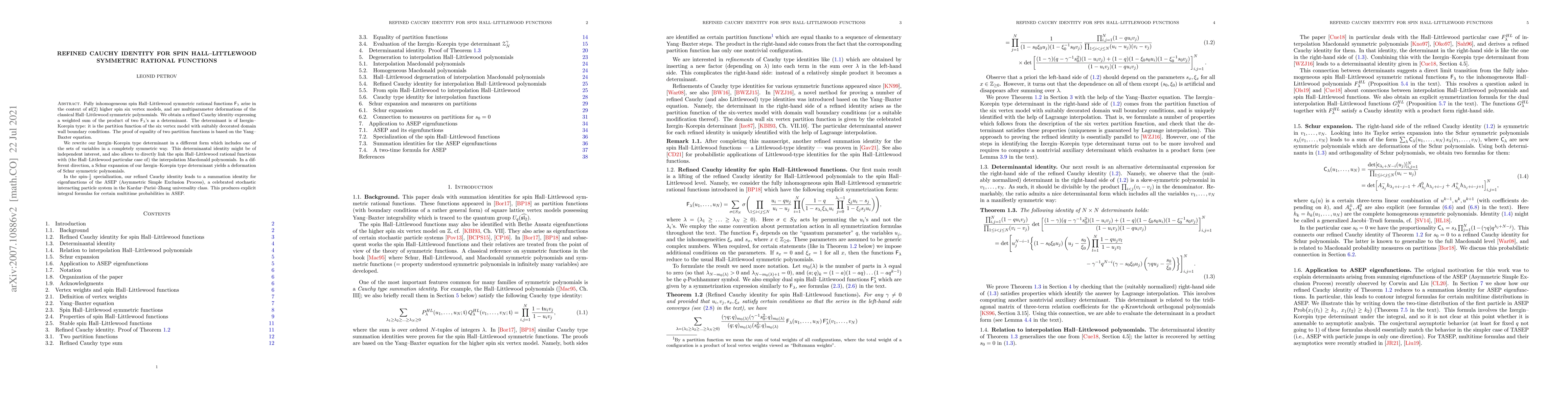 The paper presents a refined Cauchy identity for spin Hall-Littlewood symmetric rational functions, expressing a weighted sum of their products as a determinant of Izergin-Korepin type. The identity connects these functions with interpolation Macdonald polynomials and deformations of Schur symmetric polynomials.