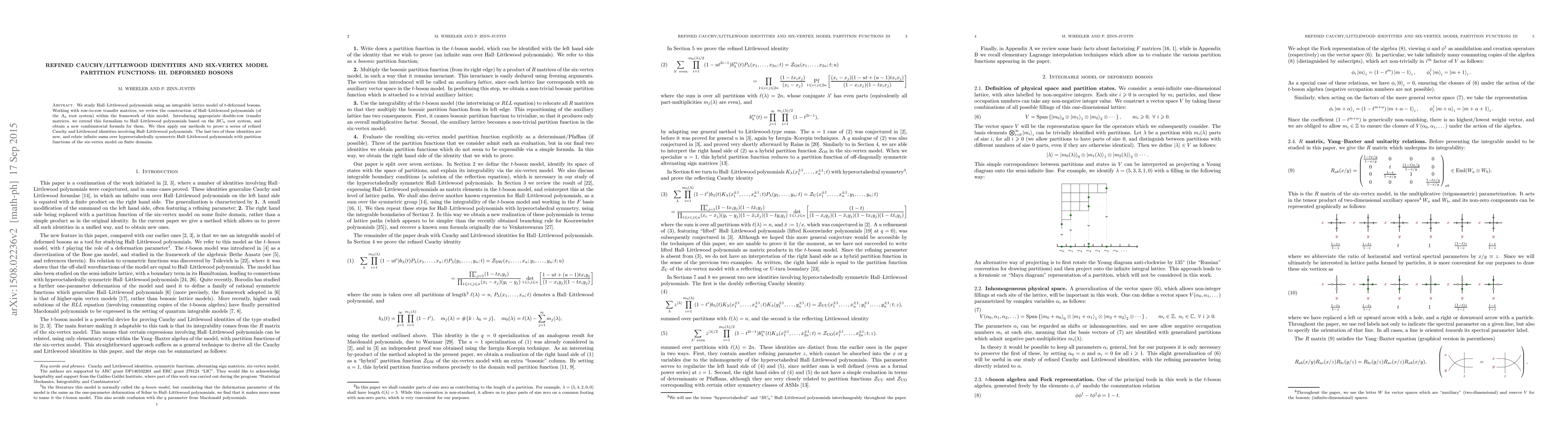 This paper studies Hall-Littlewood polynomials via a $t$-deformed bosons model, deriving a new combinatorial formula for polynomials based on $BC_n$ root systems. It establishes refined Cauchy and Littlewood identities, including new results linking these polynomials to six-vertex model partition functions.