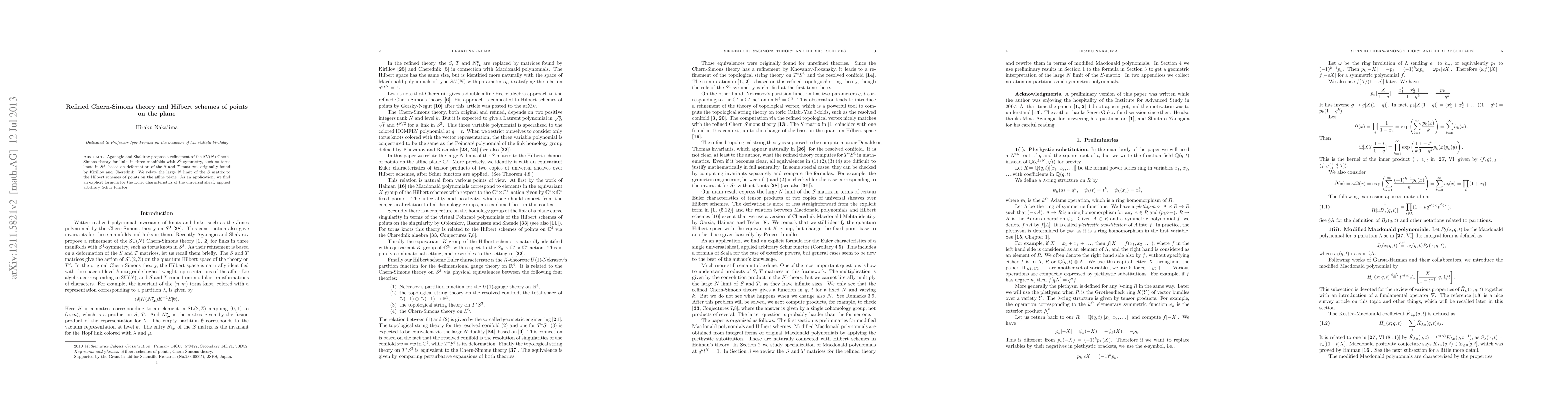This paper refines Chern-Simons theory, linking its large N S-matrix to Hilbert schemes of points on the affine plane. It applies this to find Euler characteristics of universal sheaves under arbitrary Schur functors.