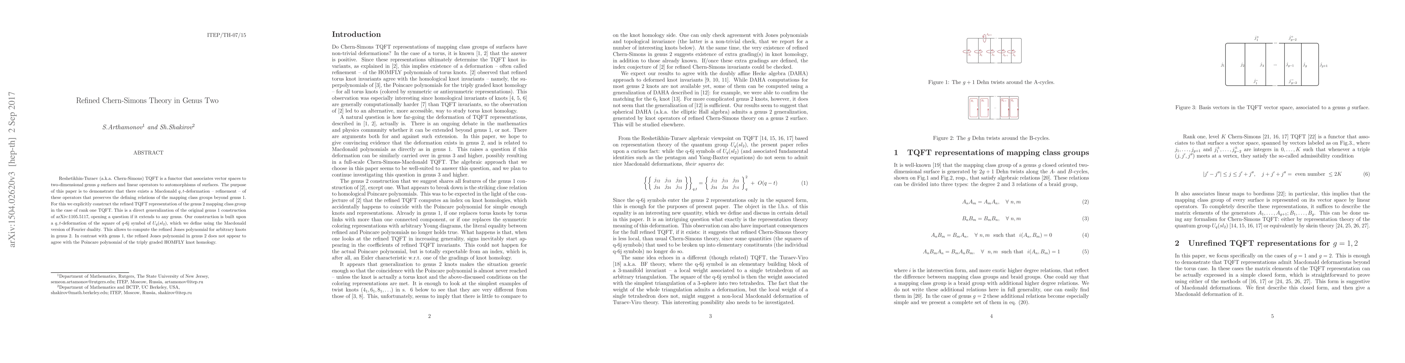 Reshetikhin-Turaev (a.k.a. Chern-Simons) TQFT is a functor that associates vector spaces to two-dimensional genus g surfaces and linear operators to automorphisms of surfaces. The purpose of this paper is to demonstrate that there exists a Macdonald q,t-deformation -- refinement -- of these operators that preserves the defining relations of the mapping class groups beyond genus 1. For this we explicitly construct the refined TQFT representation of the genus 2 mapping class group in the case of rank one TQFT. This is a direct generalization of the original genus 1 construction of arXiv:1105.5117, opening a question if it extends to any genus. Our construction is built upon a q,t-deformation of the square of q-6j symbol of U_q(sl_2), which we define using the Macdonald version of Fourier duality. This allows to compute the refined Jones polynomial for arbitrary knots in genus 2. In contrast with genus 1, the refined Jones polynomial in genus 2 does not appear to agree with the Poincare polynomial of the triply graded HOMFLY knot homology.