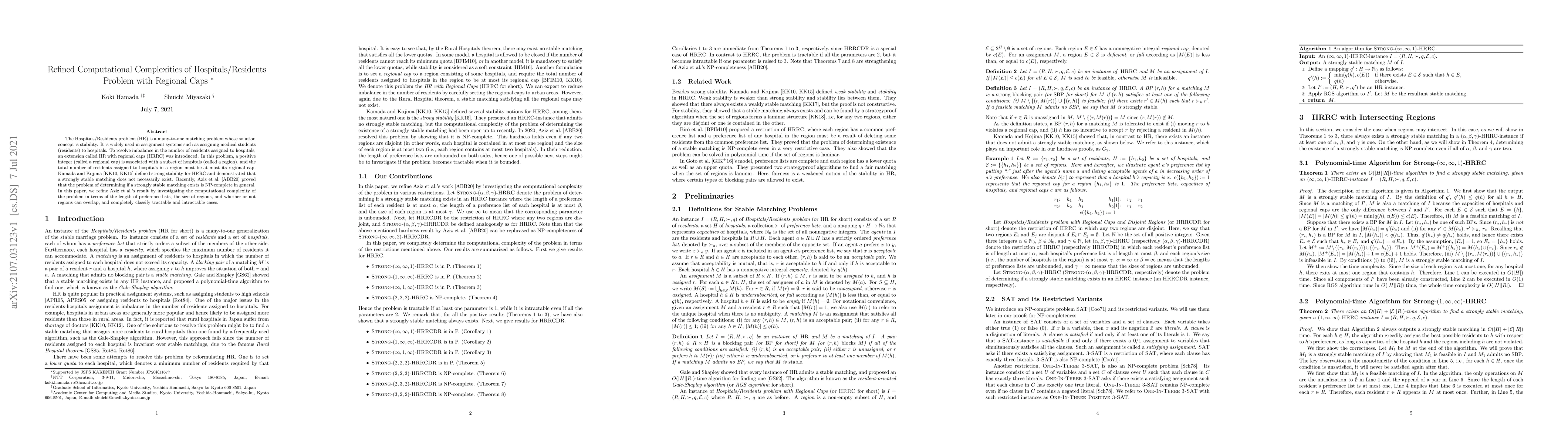 This paper refines the computational complexity of the Hospitals/Residents problem with regional caps (HRRC), exploring factors like preference list length, region size, and region overlap. It classifies the problem's tractable and intractable cases based on these factors, building on previous work showing the NP-completeness of finding strongly stable matchings in HRRC.