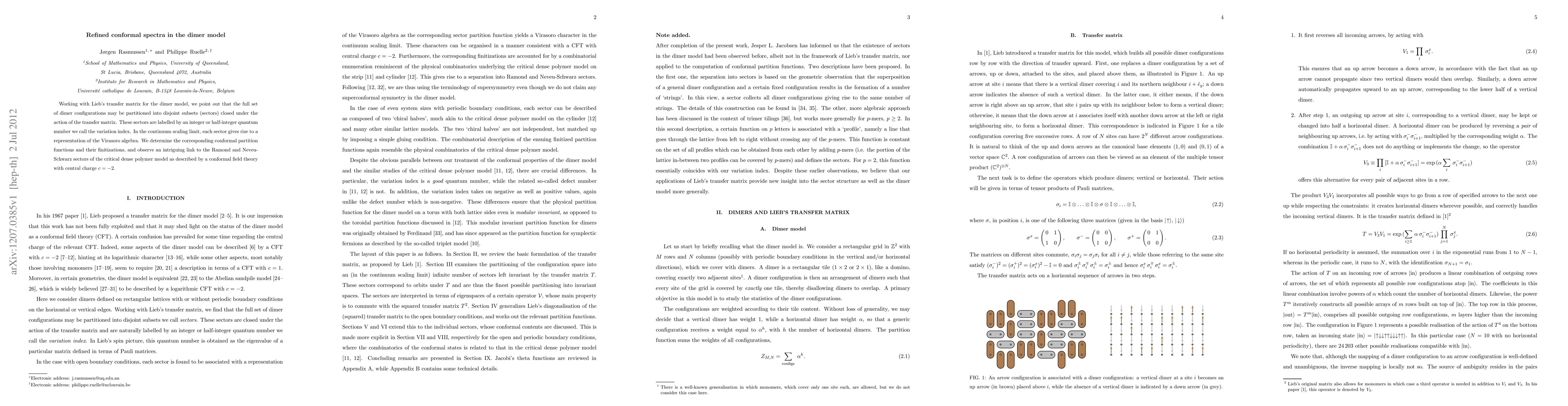 Working with Lieb's transfer matrix for the dimer model, we point out that the full set of dimer configurations may be partitioned into disjoint subsets (sectors) closed under the action of the transfer matrix. These sectors are labelled by an integer or half-integer quantum number we call the variation index. In the continuum scaling limit, each sector gives rise to a representation of the Virasoro algebra. We determine the corresponding conformal partition functions and their finitizations, and observe an intriguing link to the Ramond and Neveu-Schwarz sectors of the critical dense polymer model as described by a conformal field theory with central charge c=-2.