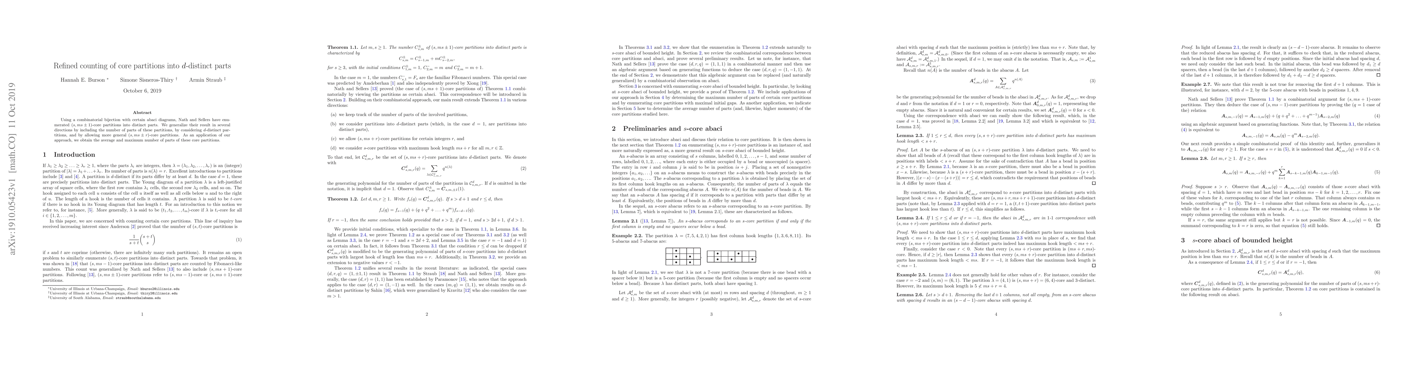 Using a combinatorial bijection with certain abaci diagrams, Nath and Sellers have enumerated $(s, m s \pm 1)$-core partitions into distinct parts. We generalize their result in several directions by including the number of parts of these partitions, by considering $d$-distinct partitions, and by allowing more general $(s, m s \pm r)$-core partitions. As an application of our approach, we obtain the average and maximum number of parts of these core partitions.