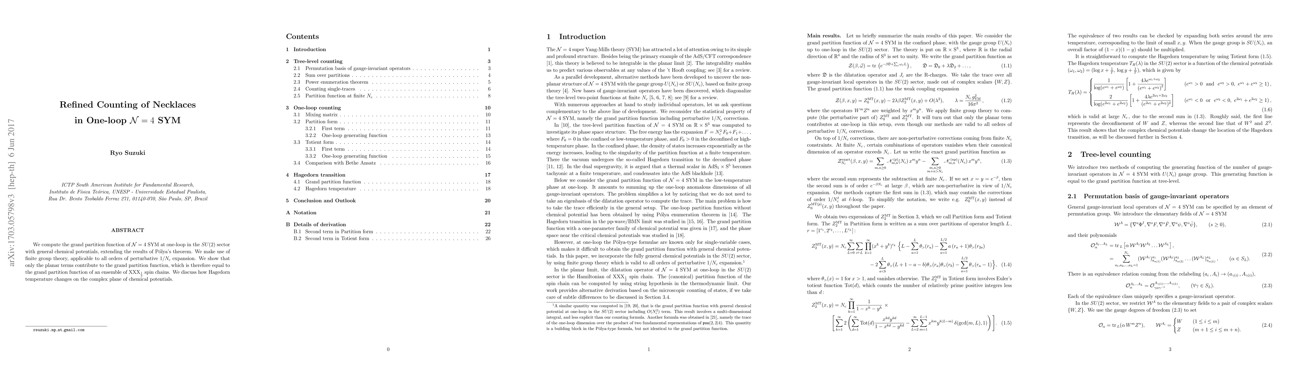 This paper computes the grand partition function of $\mathcal{N}=4$ SYM at one-loop in the $SU(2)$ sector, extending P\'olya's theorem using finite group theory. It demonstrates that only planar terms contribute, equating the grand partition function to that of XXX$_\frac12$ spin chains and discusses the impact of chemical potentials on the Hagedorn temperature.
