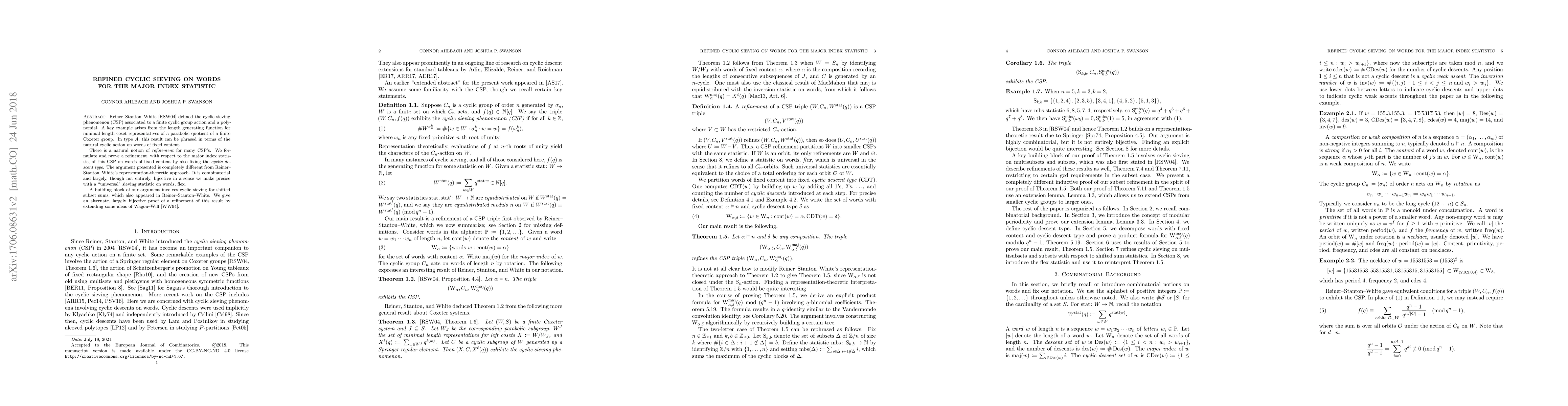 Reiner-Stanton-White defined the cyclic sieving phenomenon (CSP) associated to a finite cyclic group action and a polynomial. A key example arises from the length generating function for minimal length coset representatives of a parabolic quotient of a finite Coxeter group. In type A, this result can be phrased in terms of the natural cyclic action on words of fixed content. There is a natural notion of refinement for many CSP's. We formulate and prove a refinement, with respect to the major index statistic, of this CSP on words of fixed content by also fixing the cyclic descent type. The argument presented is completely different from Reiner-Stanton-White's representation-theoretic approach. It is combinatorial and largely, though not entirely, bijective in a sense we make precise with a "universal" sieving statistic on words, "flex". A building block of our argument involves cyclic sieving for shifted subset sums, which also appeared in Reiner-Stanton-White. We give an alternate, largely bijective proof of a refinement of this result by extending some ideas of Wagon-Wilf.