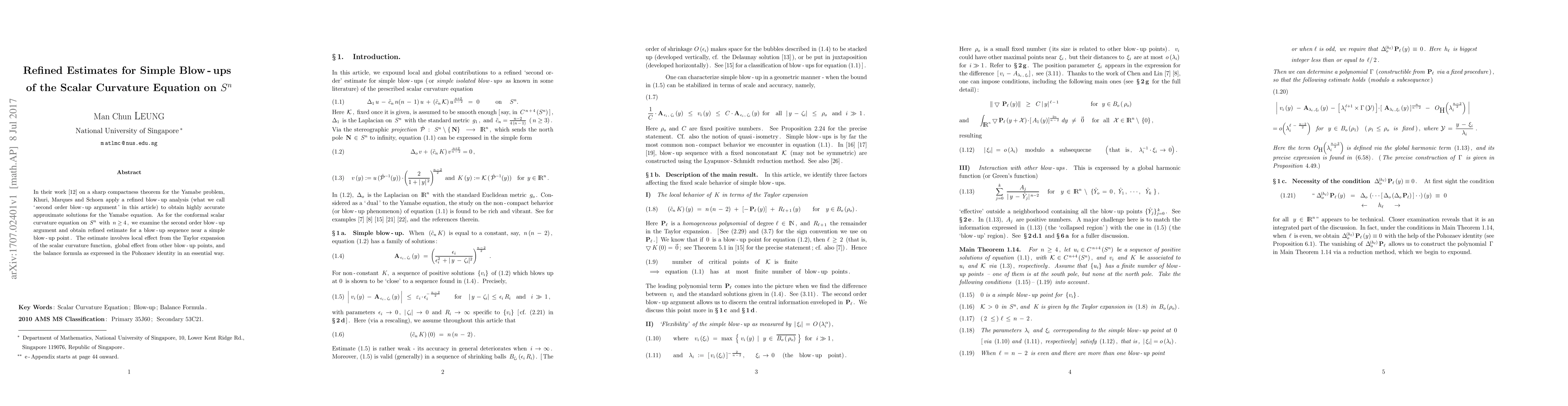 This paper refines estimates for simple blow-ups in the scalar curvature equation on S^n using a second-order blow-up analysis. The authors achieve highly accurate approximate solutions for the Yamabe equation by incorporating local Taylor expansion effects, global influences from other blow-up points, and the balance formula from the Pohozaev identity.