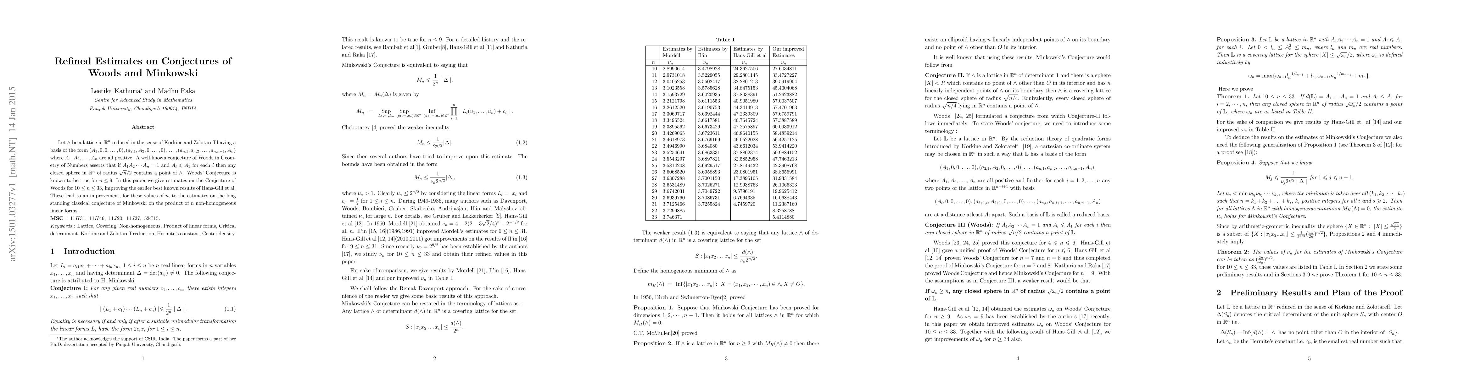 Let $\wedge$ be a lattice in $\mathbb{R}^n$ reduced in the sense of Korkine and Zolotareff having a basis of the form $(A_1,0,0,\ldots,0),(a_{2,1},A_2,0,\ldots,0)$, $\ldots,(a_{n,1},a_{n,2},\ldots,a_{n,n-1},A_n)$ where $A_1, A_2,\ldots,A_n$ are all positive. A well known conjecture of Woods in Geometry of Numbers asserts that if $A_{1}A_{2}\cdots A_{n}=1$ and $A_{i}\leqslant A_{1}$ for each $i$ then any closed sphere in $\mathbb{R}^n $ of radius $ \sqrt{n}/2$ contains a point of $\wedge$. Woods' Conjecture is known to be true for $n\leq 9$. In this paper we give estimates on the Conjecture of Woods for $10\leq n\leq33$, improving the earlier best known results of Hans-Gill et al. These lead to an improvement, for these values of $n$, to the estimates on the long standing classical conjecture of Minkowski on the product of $n$ non-homogeneous linear forms.