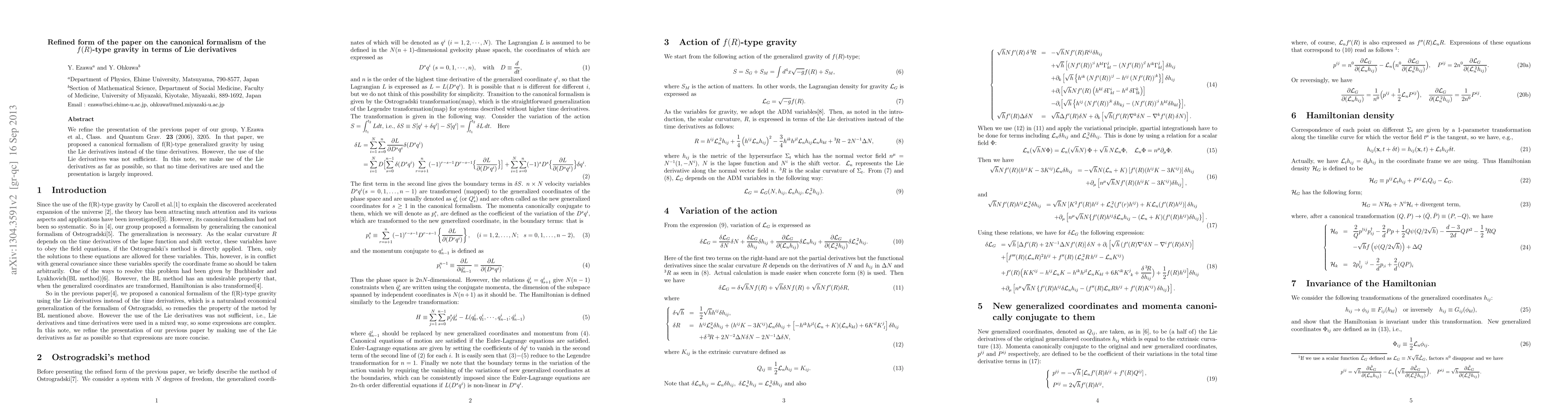 We refine the presentation of the previous paper of our group, Y.Ezawa et al., Class. Quantum Grav. {\bf 23} (2006), 3205 [arXiv:gr-qc/0507060]. In that paper, we proposed a canonical formalism of f(R)-type generalized gravity by using the Lie derivatives instead of the time derivatives. However, the use of the Lie derivatives was not sufficient. In this note, we make use of the Lie derivatives as far as possible, so that no time derivatives are used.