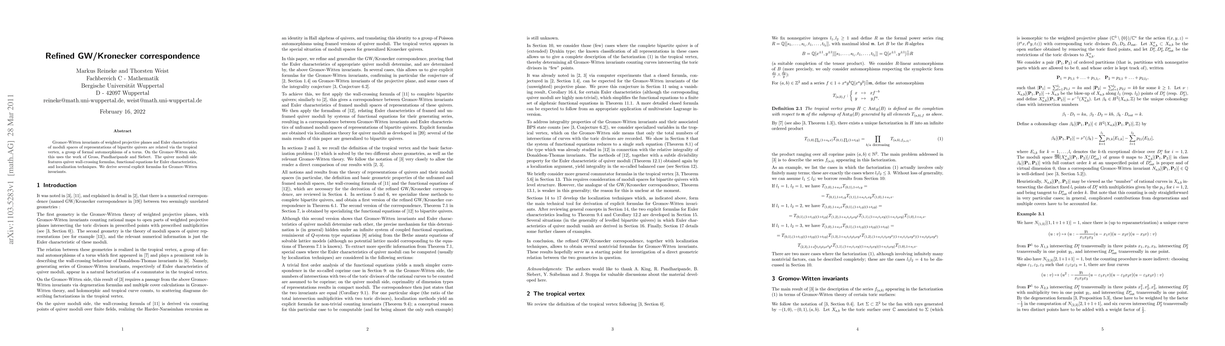 Gromov-Witten invariants of weighted projective planes and Euler characteristics of moduli spaces of representations of bipartite quivers are related via the tropical vertex, a group of formal automorphisms of a torus. On the Gromov-Witten side, this uses the work of Gross, Pandharipande and Siebert. The quiver moduli side features quiver wall-crossing formulas, functional equations for Euler characteristics, and localization techniques. We derive several explicit formulas for Gromov-Witten invariants.