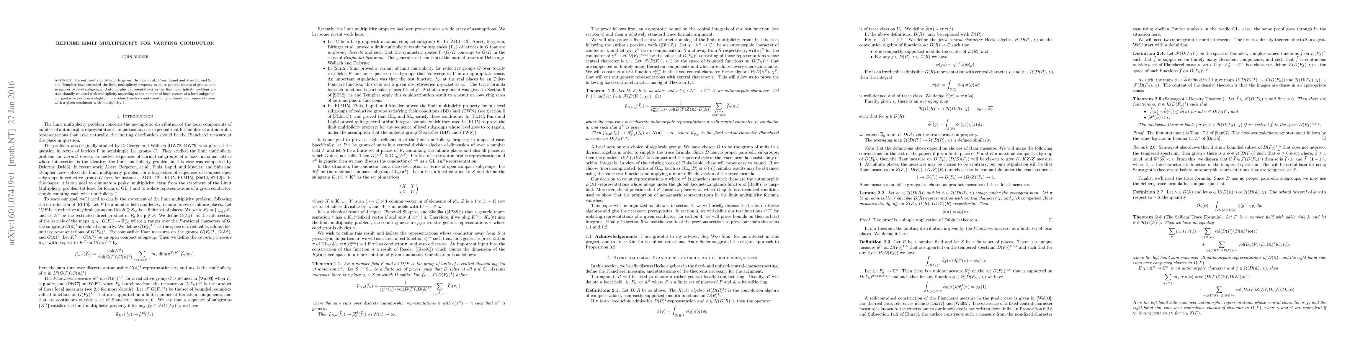 This research refines the limit multiplicity property in automorphic representation counting, focusing on automorphic representations with a given conductor and multiplicity 1, thereby providing a more precise analysis than previous works.