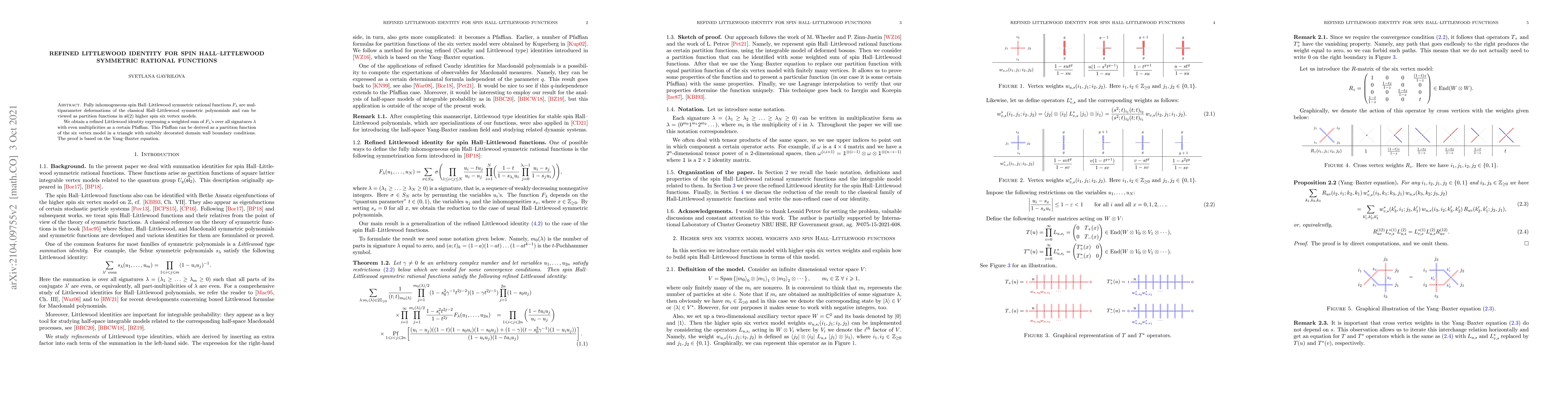 Fully inhomogeneous spin Hall-Littlewood symmetric rational functions $F_\lambda$ are multiparameter deformations of the classical Hall-Littlewood symmetric polynomials and can be viewed as partition functions in $\mathfrak{sl}(2)$ higher spin six vertex models. We obtain a refined Littlewood identity expressing a weighted sum of $F_\lambda$'s over all partitions $\lambda$ with even multiplicities as a certain Pfaffian. This Pfaffian can be derived as a partition function of the six vertex model in a triangle with suitably decorated domain wall boundary conditions. The proof is based on the Yang-Baxter equation.
