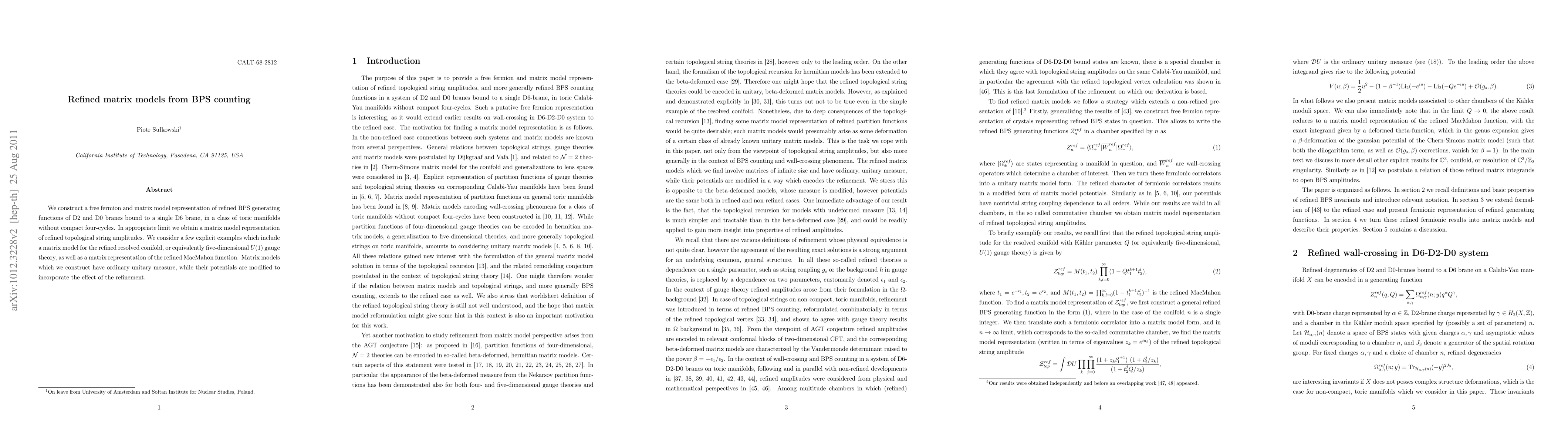 This paper develops matrix models for refined BPS counting of D2 and D0 branes bound to D6 branes in specific toric manifolds. The models yield refined topological string amplitudes and include examples like the refined conifold and MacMahon function, with modified potentials to account for refinement.
