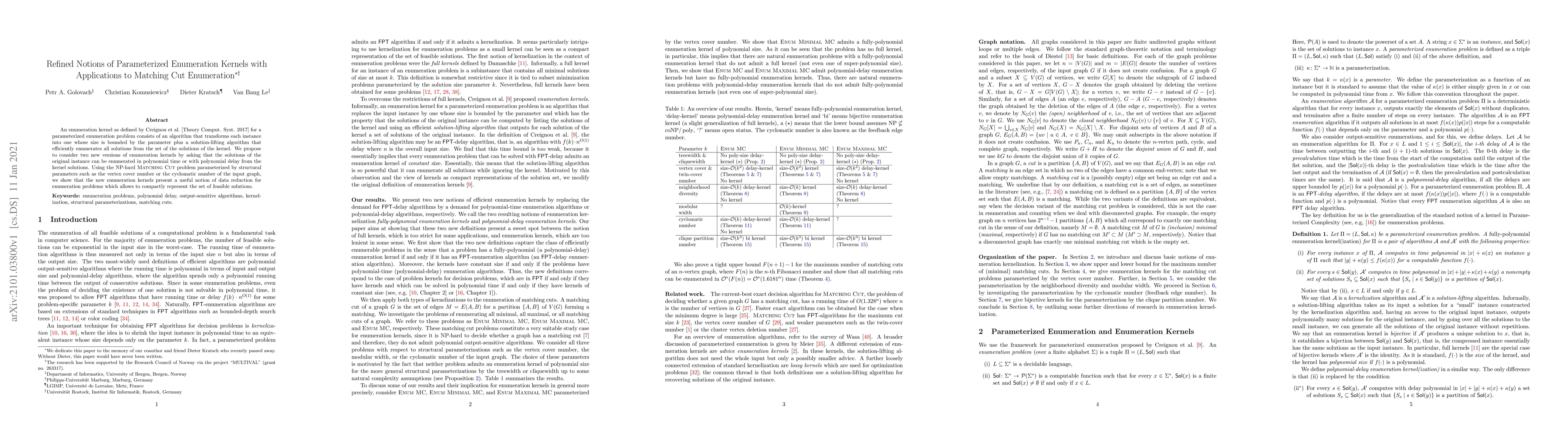 This paper introduces refined notions of enumeration kernels for parameterized enumeration problems, proposing two new versions that allow for polynomial-time or polynomial-delay enumeration of solutions from the kernel. It demonstrates the utility of these kernels through applications to the NP-hard Matching Cut problem, showing they enable compact representation of feasible solutions.