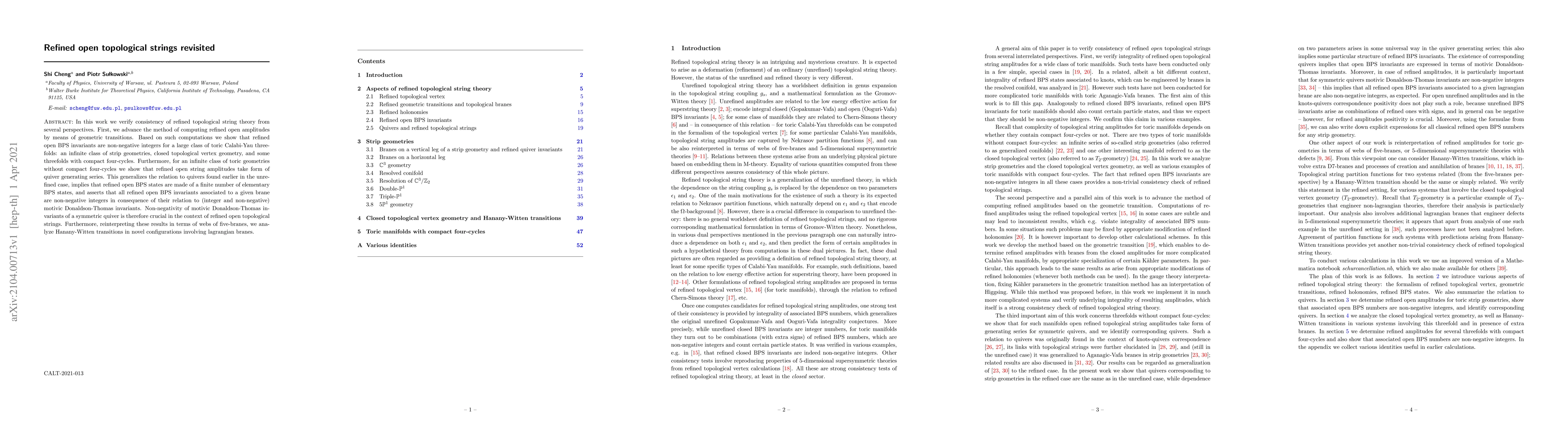 In this work we verify consistency of refined topological string theory from several perspectives. First, we advance the method of computing refined open amplitudes by means of geometric transitions. Based on such computations we show that refined open BPS invariants are non-negative integers for a large class of toric Calabi-Yau threefolds: an infinite class of strip geometries, closed topological vertex geometry, and some threefolds with compact four-cycles. Furthermore, for an infinite class of toric geometries without compact four-cycles we show that refined open string amplitudes take form of quiver generating series. This generalizes the relation to quivers found earlier in the unrefined case, implies that refined open BPS states are made of a finite number of elementary BPS states, and asserts that all refined open BPS invariants associated to a given brane are non-negative integers in consequence of their relation to (integer and non-negative) motivic Donaldson-Thomas invariants. Non-negativity of motivic Donaldson-Thomas invariants of a symmetric quiver is therefore crucial in the context of refined open topological strings. Furthermore, reinterpreting these results in terms of webs of five-branes, we analyze Hanany-Witten transitions in novel configurations involving lagrangian branes.