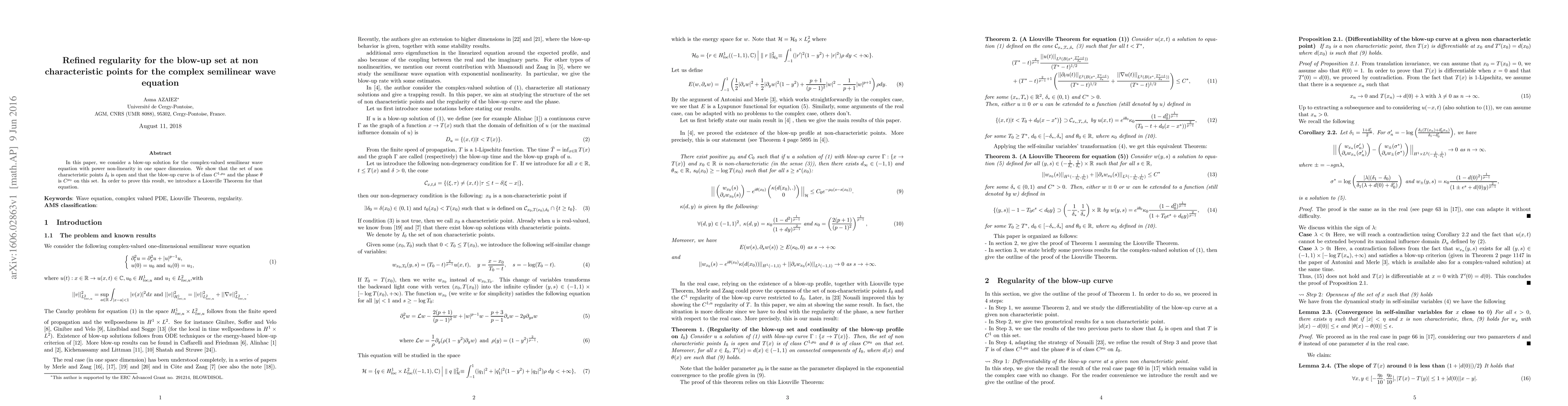 This paper examines blow-up solutions for a complex-valued semilinear wave equation in one dimension, proving that the set of non characteristic points is open and demonstrating refined regularity for the blow-up curve and phase function using a new Liouville Theorem.