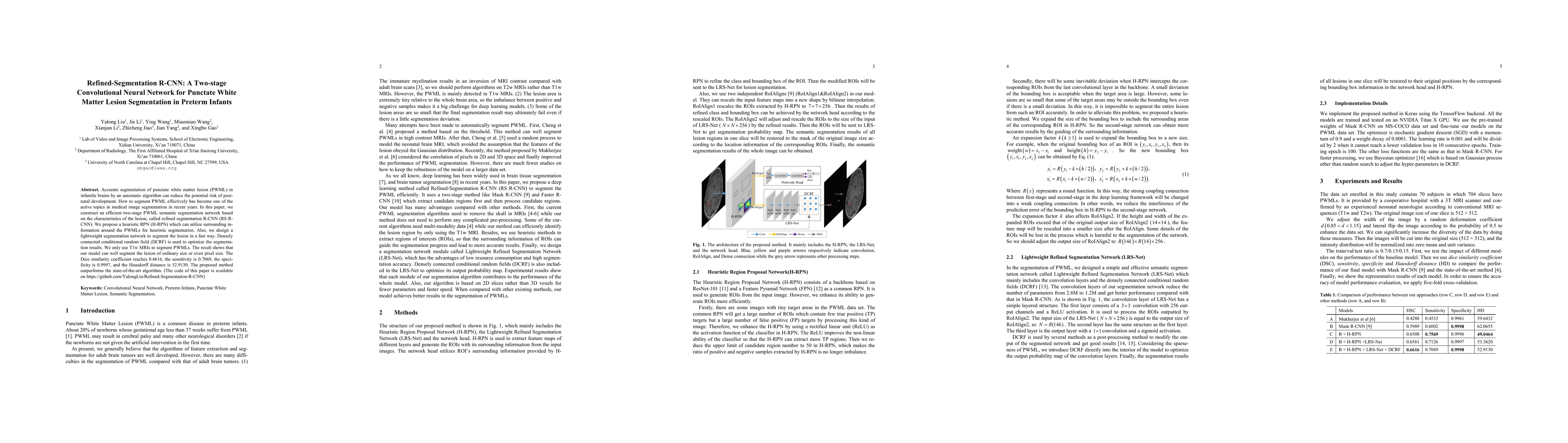 This paper introduces a refined segmentation R-CNN (RS RCNN) for segmenting punctate white matter lesions (PWML) in preterm infants' MRIs, employing a heuristic RPN and a lightweight segmentation network. The method achieves high accuracy with a Dice coefficient of 0.6616, sensitivity of 0.7069, and specificity of 0.9997, outperforming existing algorithms.