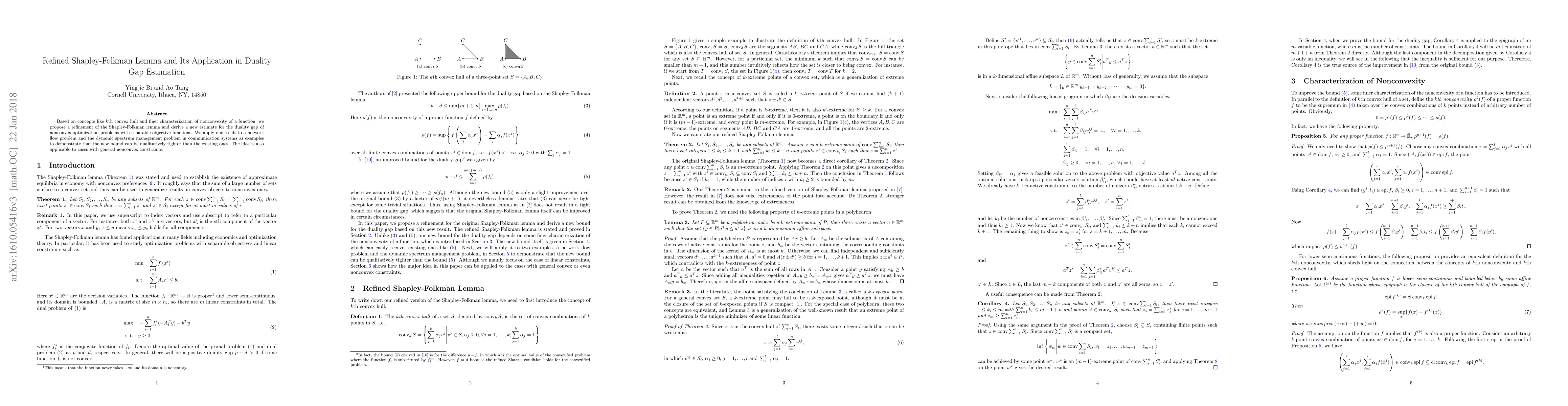 Based on concepts like kth convex hull and finer characterization of nonconvexity of a function, we propose a refinement of the Shapley-Folkman lemma and derive a new estimate for the duality gap of nonconvex optimization problems with separable objective functions. We apply our result to a network flow problem and the dynamic spectrum management problem in communication systems as examples to demonstrate that the new bound can be qualitatively tighter than the existing ones. The idea is also applicable to cases with general nonconvex constraints.
