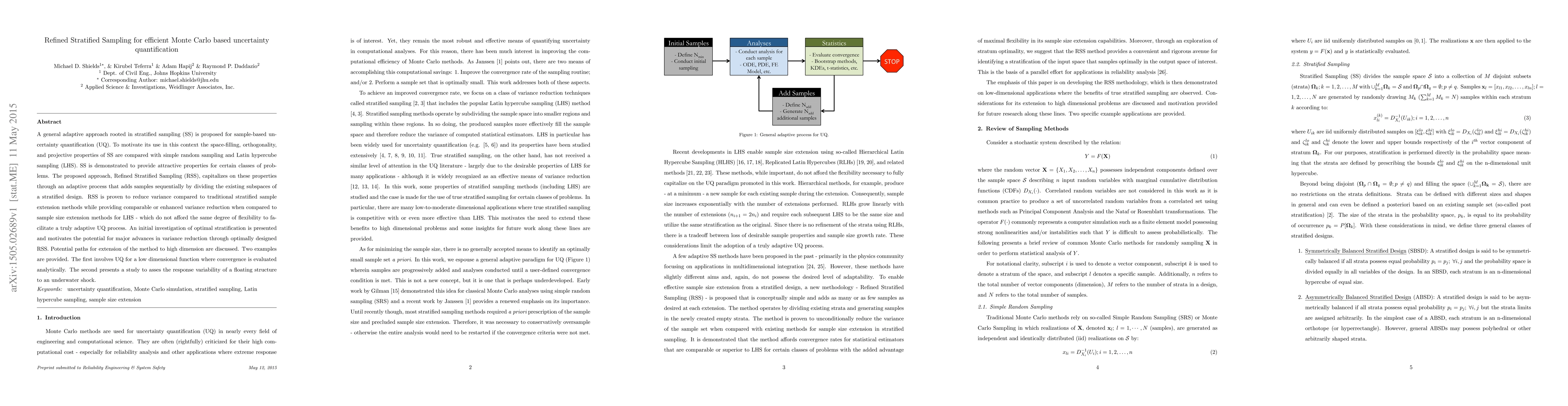 This paper proposes Refined Stratified Sampling (RSS) for efficient Monte Carlo uncertainty quantification, demonstrating its adaptive process reduces variance compared to traditional methods. The method leverages the properties of stratified sampling, showing potential for significant variance reduction and extension to high-dimensional problems.