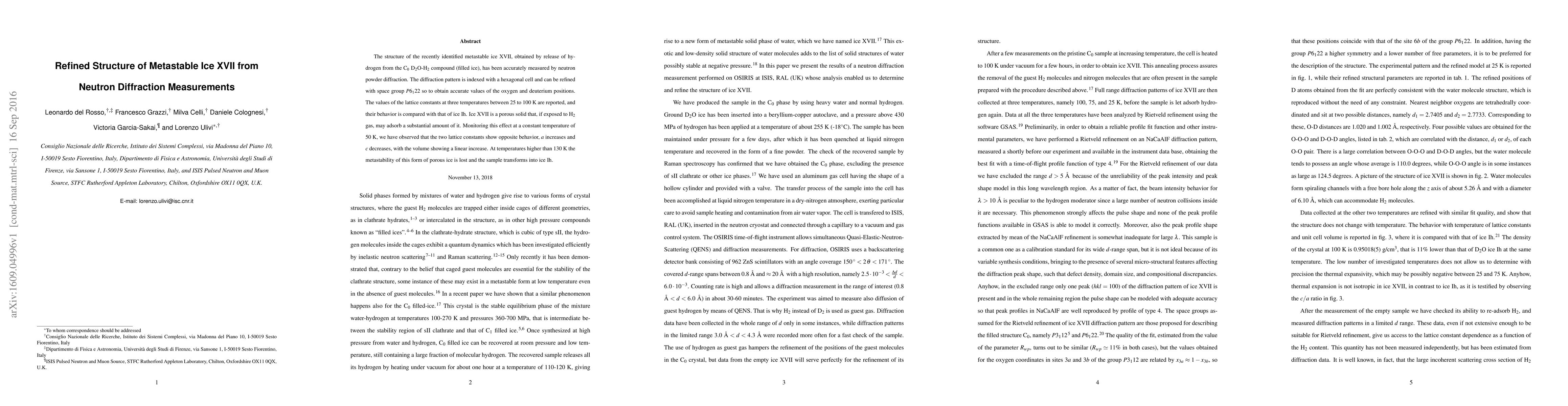 This study refines the structure of metastable ice XVII using neutron diffraction, revealing its hexagonal $P6_122$ space group and precise lattice constants. The porous ice exhibits unique lattice behavior under H$_2$ gas exposure, with opposing changes in $a$ and $c$ lattice constants, while transforming to ice Ih above 130 K.