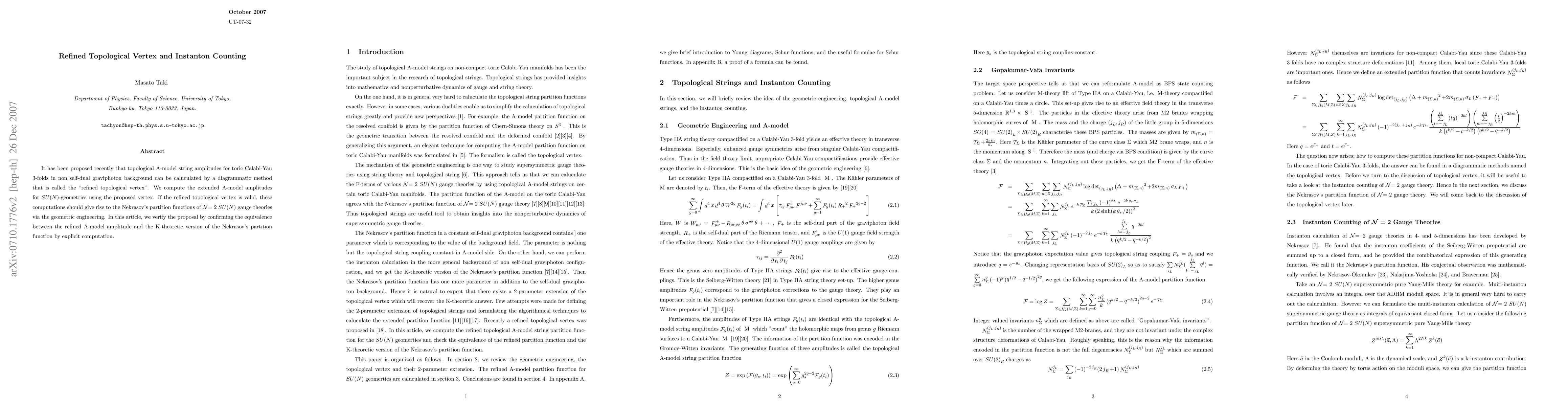 This research verifies the proposal that topological A-model string amplitudes for Calabi-Yau 3-folds can be calculated using the refined topological vertex. The study confirms the equivalence between refined A-model amplitudes and Nekrasov's partition functions for SU(N)-geometries through explicit computation.