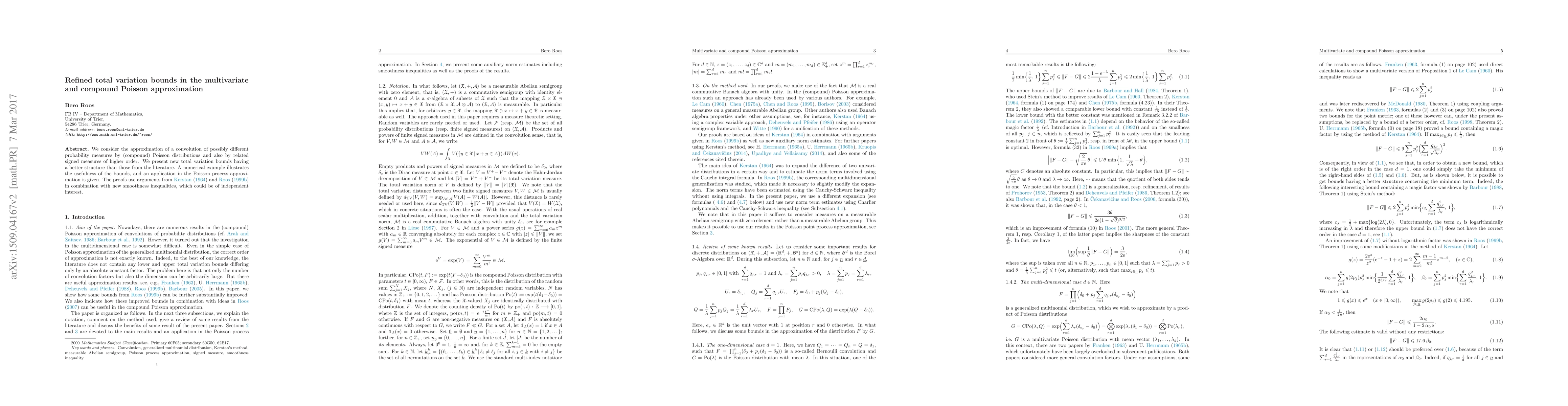 We consider the approximation of a convolution of possibly different probability measures by (compound) Poisson distributions and also by related signed measures of higher order. We present new total variation bounds having a better structure than those from the literature. A numerical example illustrates the usefulness of the bounds, and an application in the Poisson process approximation is given. The proofs use arguments from Kerstan (Z. Wahrscheinlichkeitstheorie und Verw. Gebiete 2 (1964) 173-179) and Roos (J. Multivariate Anal. 69 (1999) 120-134) in combination with new smoothness inequalities, which could be of independent interest.