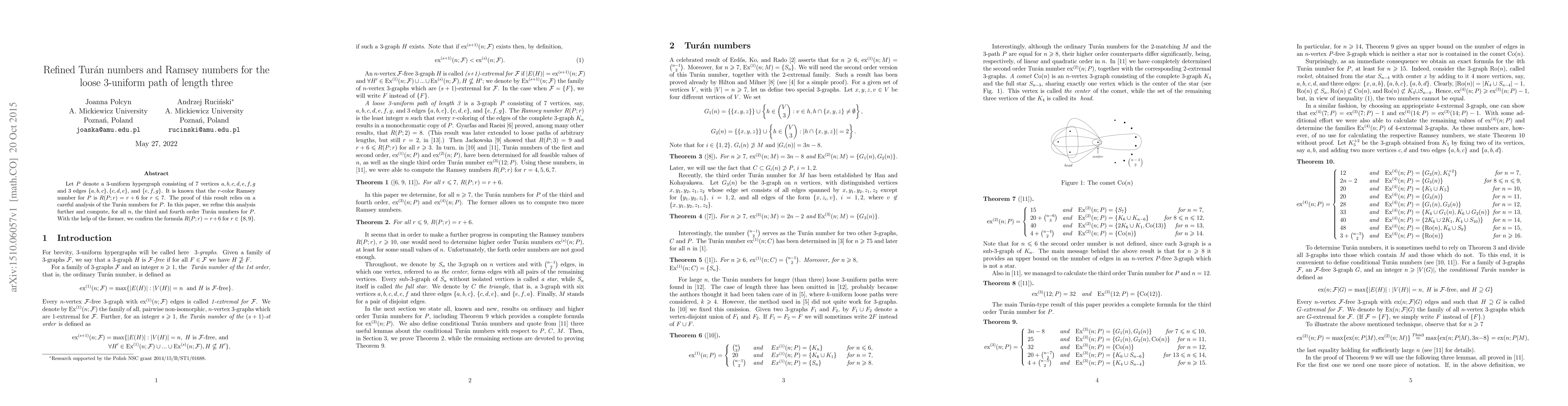 Let $P$ denote a 3-uniform hypergraph consisting of 7 vertices $a,b,c,d,e,f,g$ and 3 edges $\{a,b,c\}, \{c,d,e\},$ and $\{e,f,g\}$. It is known that the $r$-color Ramsey number for $P$ is $R(P;r)=r+6$ for $r\le 7$. The proof of this result relies on a careful analysis of the Tur\'an numbers for $P$. In this paper, we refine this analysis further and compute, for all $n$, the third and fourth order Tur\'an numbers for $P$. With the help of the former, we confirm the formula $R(P;r)=r+6$ for $r\in\{8,9\}$.