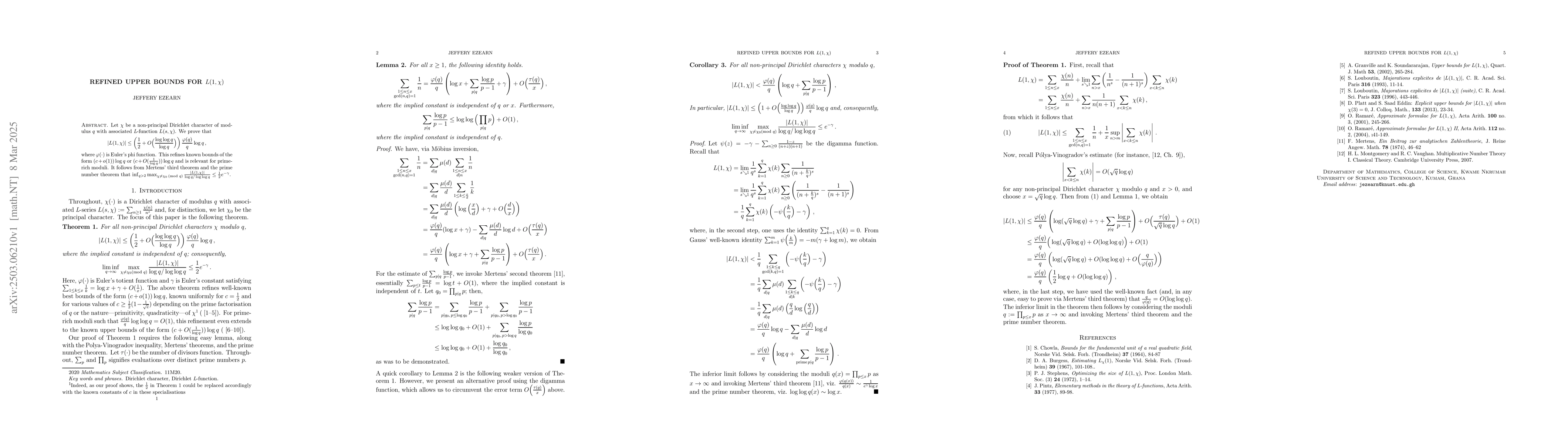 The paper employs techniques from analytic number theory, leveraging Mertens' third theorem and the prime number theorem to derive refined upper bounds for $|L(1, \chi)|$ where $\chi$ is a non-principal Dirichlet character of modulus $q$.