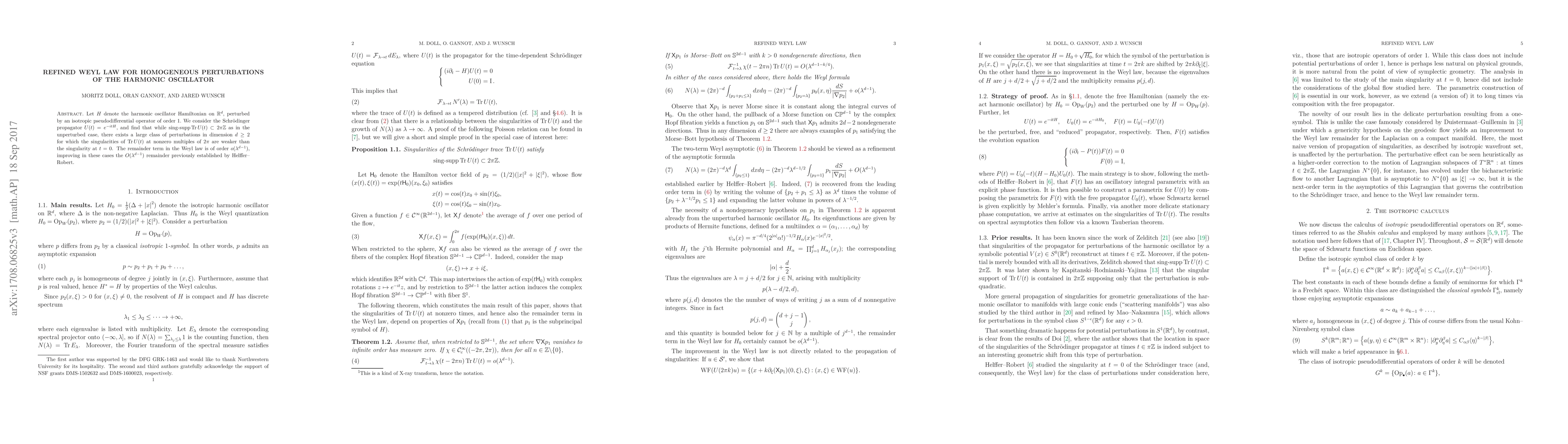 Let $H$ denote the harmonic oscillator Hamiltonian on $\mathbb{R}^d,$ perturbed by an isotropic pseudodifferential operator of order $1.$ We consider the Schr\"odinger propagator $U(t)=e^{-itH},$ and find that while $\operatorname{singsupp} \operatorname{Tr} U(t) \subset 2 \pi \mathbb{Z}$ as in the unperturbed case, there exists a large class of perturbations in dimension $d \geq 2$ for which the singularities of $\operatorname{Tr} U(t)$ at nonzero multiples of $2 \pi$ are weaker than the singularity at $t=0$. The remainder term in the Weyl law is of order $o(\lambda^{d-1})$, improving in these cases the $O(\lambda^{d-1})$ remainder previously established by Helffer--Robert.