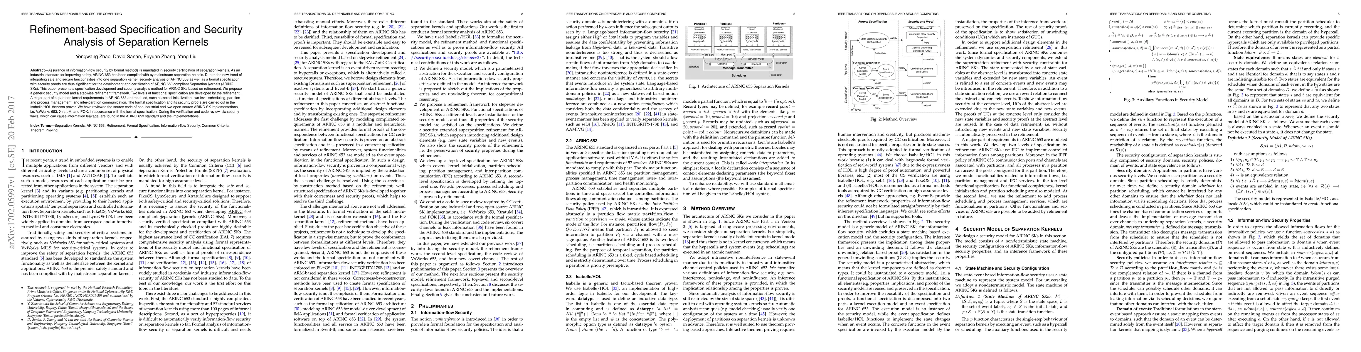 This paper develops a formal specification and security analysis method for ARINC 653 compliant Separation Kernels using refinement techniques. It identifies and rectifies six security flaws in the standard and implementations, including VxWorks 653, XtratuM, and POK, through a stepwise refinement framework and formal proofs in Isabelle/HOL.