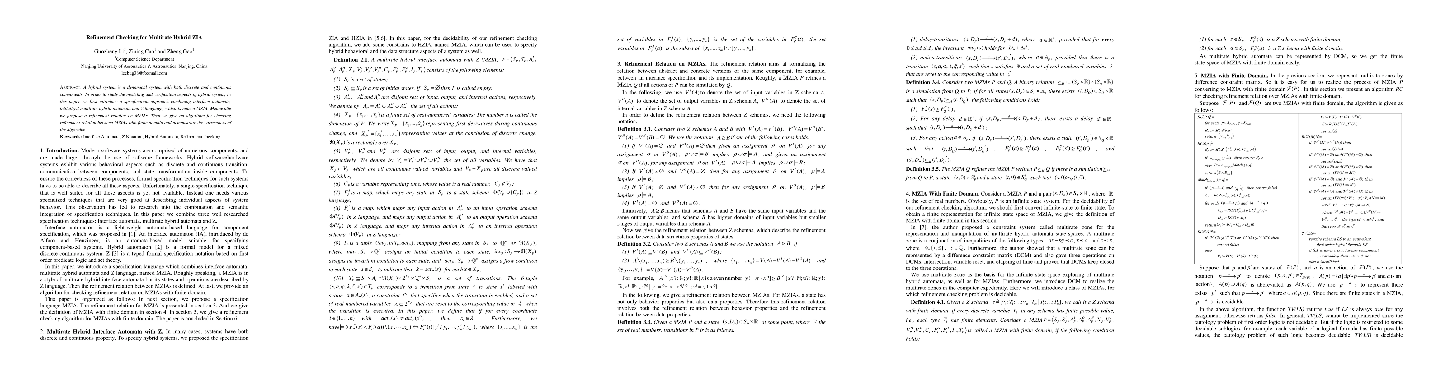 A hybrid system is a dynamical system with both discrete and continuous components. In order to study the modeling and verification aspects of hybrid system, in this paper we first introduce a specification approach combining interface automata, initialized multirate hybrid automata and Z language, which is named MZIA. Meanwhile we propose a refinement relation on MZIAs. Then we give an algorithm for checking refinement relation between MZIAs with finite domain and demonstrate the correctness of the algorithm.