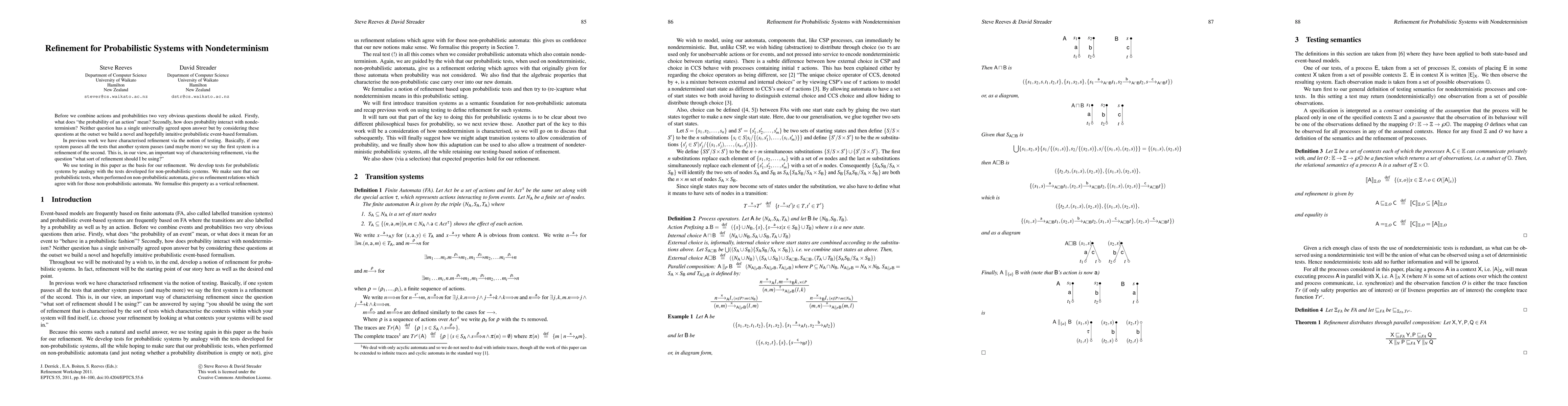 This paper introduces a novel probabilistic event-based formalism to address the interaction between probability and nondeterminism, using testing as a basis for system refinement. It ensures that probabilistic tests align with non-probabilistic automata, formalizing a vertical refinement relation.