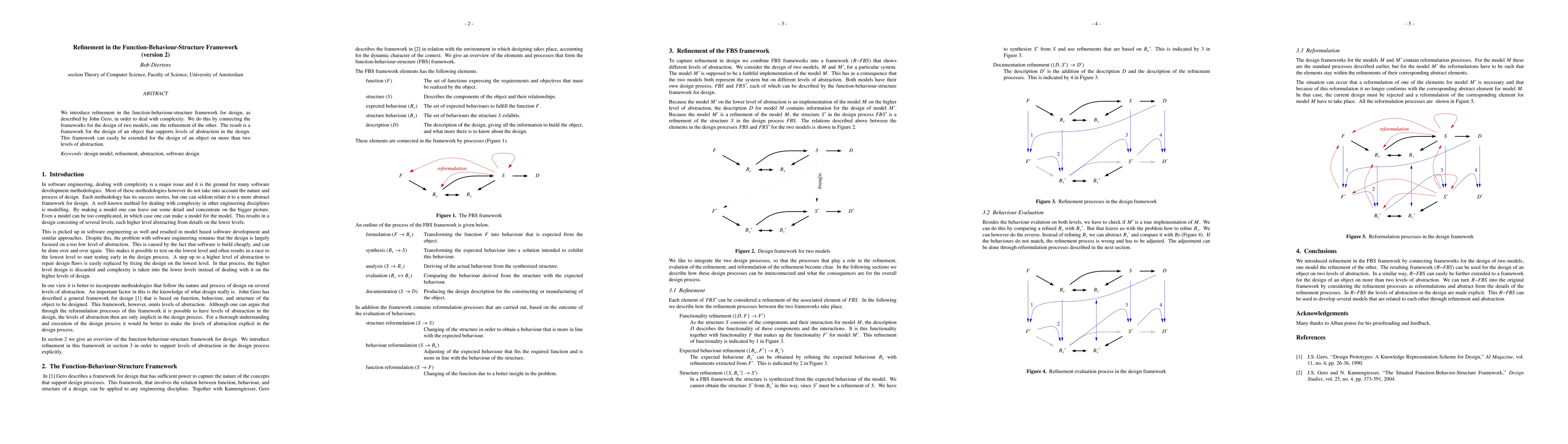 We introduce refinement in the function-behaviour-structure framework for design, as described by John Gero, in order to deal with complexity. We do this by connecting the frameworks for the design of two models, one the refinement of the other. The result is a framework for the design of an object that supports levels of abstraction in the design. This framework can easily be extended for the design of an object on more than two levels of abstraction.