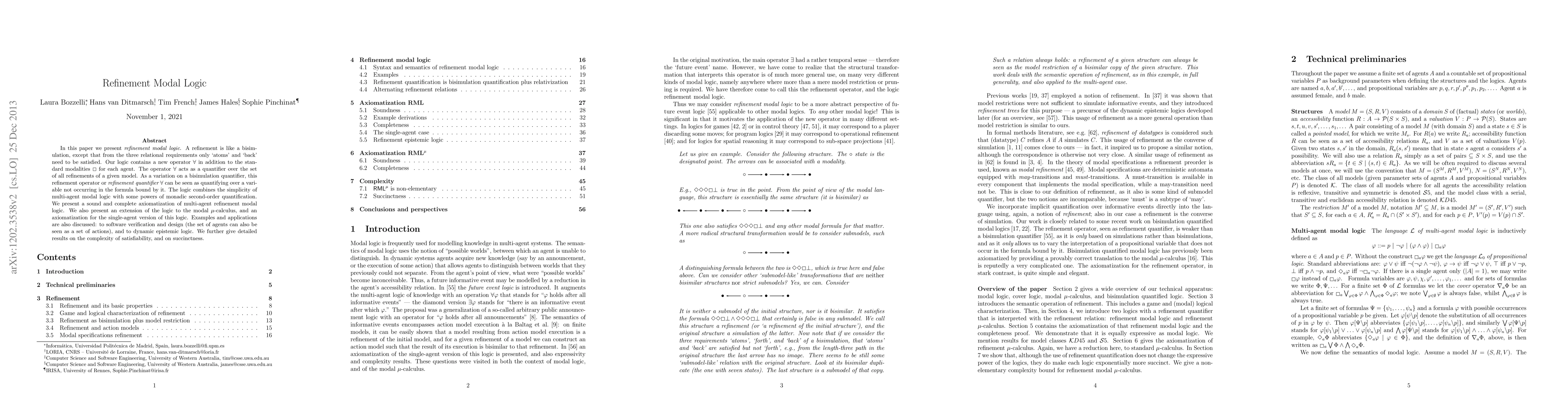 This paper introduces refinement modal logic, which simplifies bisimulation by relaxing relational requirements, and includes a new 'all' quantifier. It presents a sound and complete axiomatization, extends it to the modal mu-calculus, and discusses applications in software verification and dynamic epistemic logic, along with complexity results.